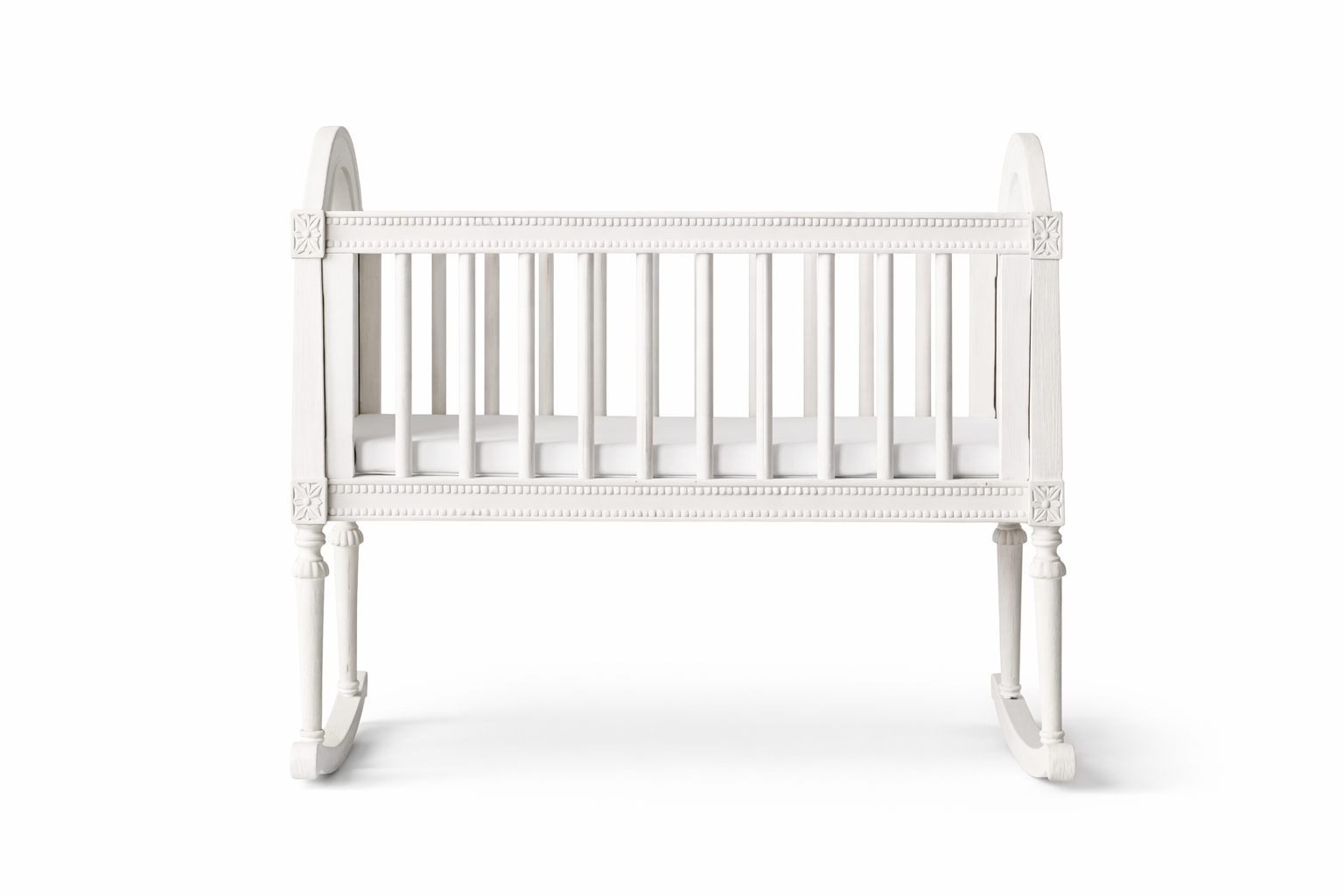 Create a serene and elegant nursery with the Baby Rocking Cradle, designed in a classic French-inspired silhouette. Crafted from solid wood and finished in a soft white tone, this cradle combines timeless beauty with gentle functionality. The curved rocking legs allow smooth, calming motions to help your baby drift to sleep naturally. Perfect for newborns, this piece adds a touch of sophistication to any nursery while ensuring safety and comfort. Its handcrafted details and elegant arches make it a true heirloom piece.