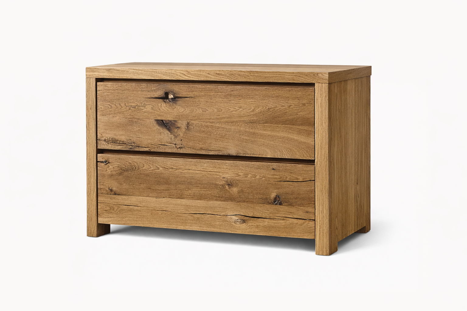 The Blissful Nightstand is a timeless piece that combines raw natural beauty with minimalist design. Made from solid wood, its rustic grain and subtle imperfections highlight the authenticity of the material. With two wide drawers, it provides practical storage for books, essentials, or nighttime accessories, while maintaining a clean and elegant look beside your bed.