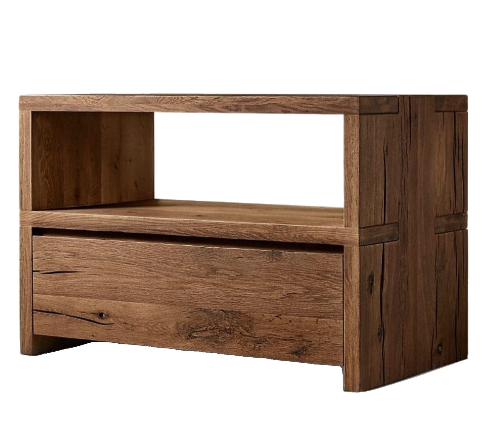 Elevate your bedroom with the Blissful Shelf Nightstand, a perfect blend of rustic authenticity and functional design. Built from premium solid wood, this nightstand features clean lines, warm tones, and a natural grain finish that highlights the beauty of real wood.
