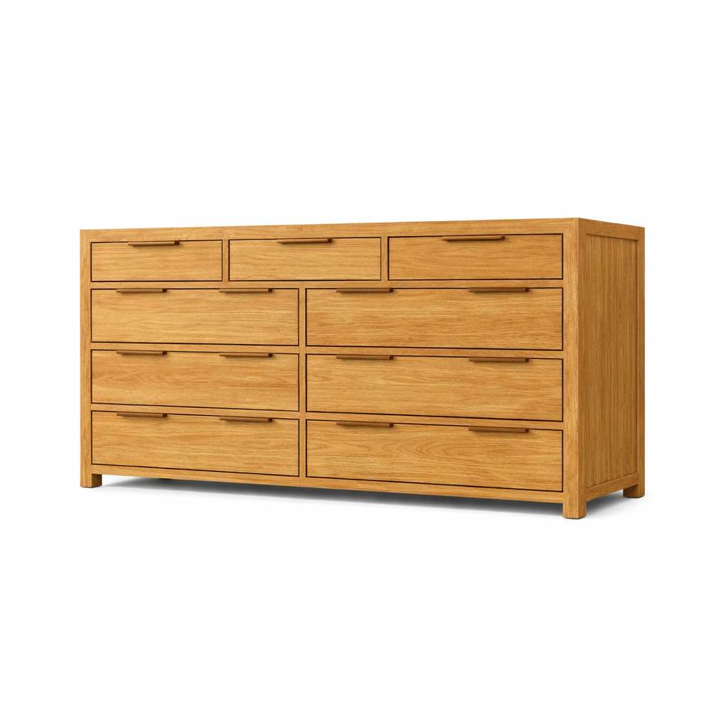 The Boho Grande Dresser is where earthy textures meet modern utility. Crafted from high-quality natural wood, this statement piece features nine spacious drawers that provide ample storage for clothing, linens, or accessories — making it ideal for bedrooms, dressing areas, or even living spaces.