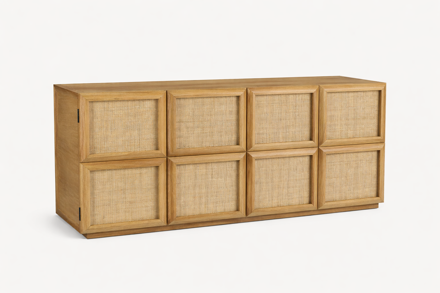 Brume Sideboard is a wooden sideboard in Egypt with cane panels and spacious storage for living and dining spaces.