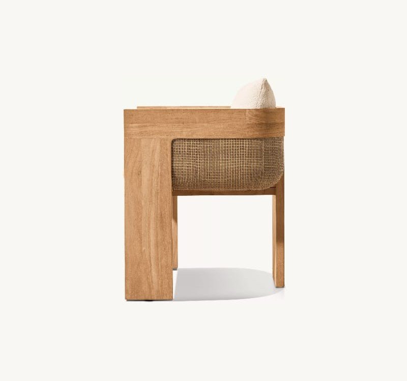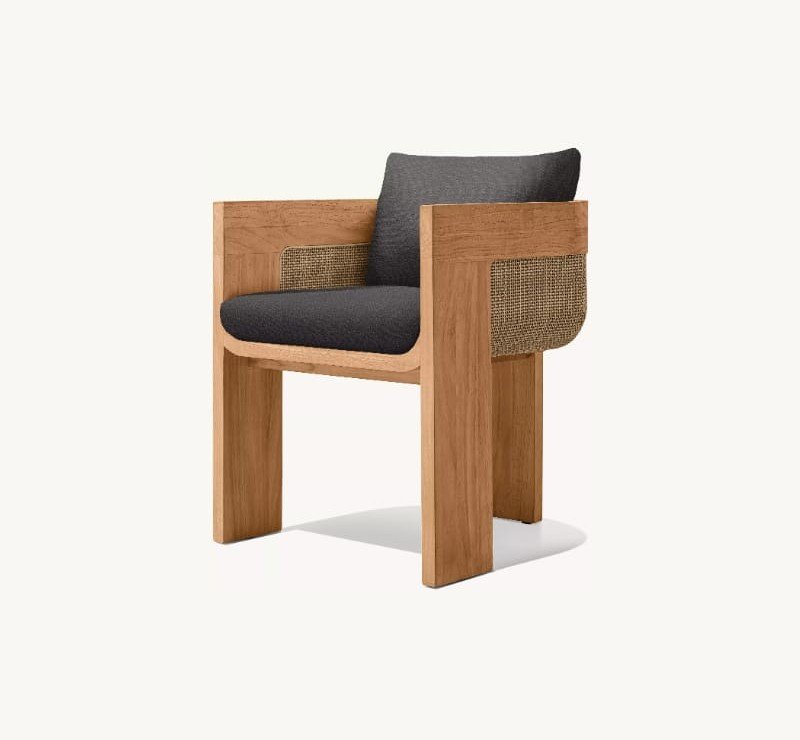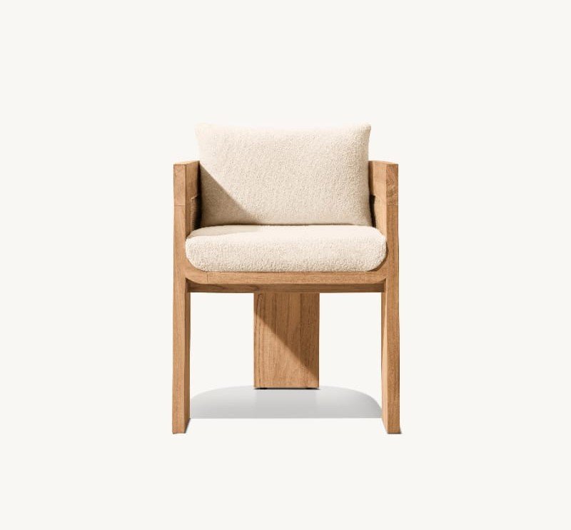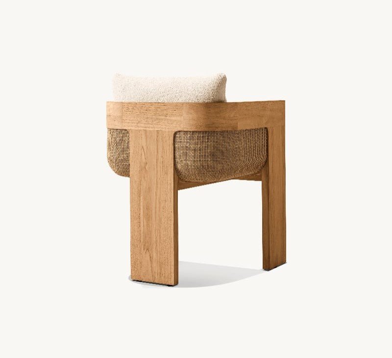 Available in Mosky wood, Pitch Pine, or Teak wood upon request, the structure is finished with a natural matte varnish that enhances the wood’s character. The seat and back cushions are upholstered in high-performance outdoor fabric, making this chair perfectly suited for both indoor dining areas and covered outdoor terraces.