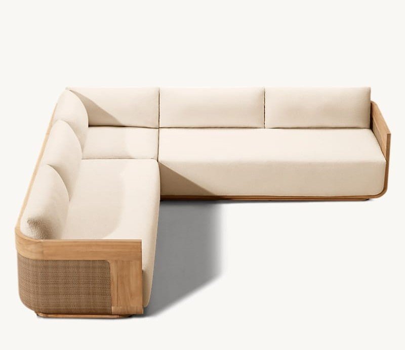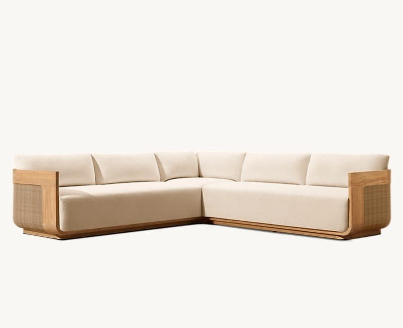 A sculptural solid wood sectional sofa with natural cane panels and plush upholstery. The Caramel Cane Sectional Sofa blends architectural lines with artisanal textures, offering luxurious comfort for spacious living areas and terraces.