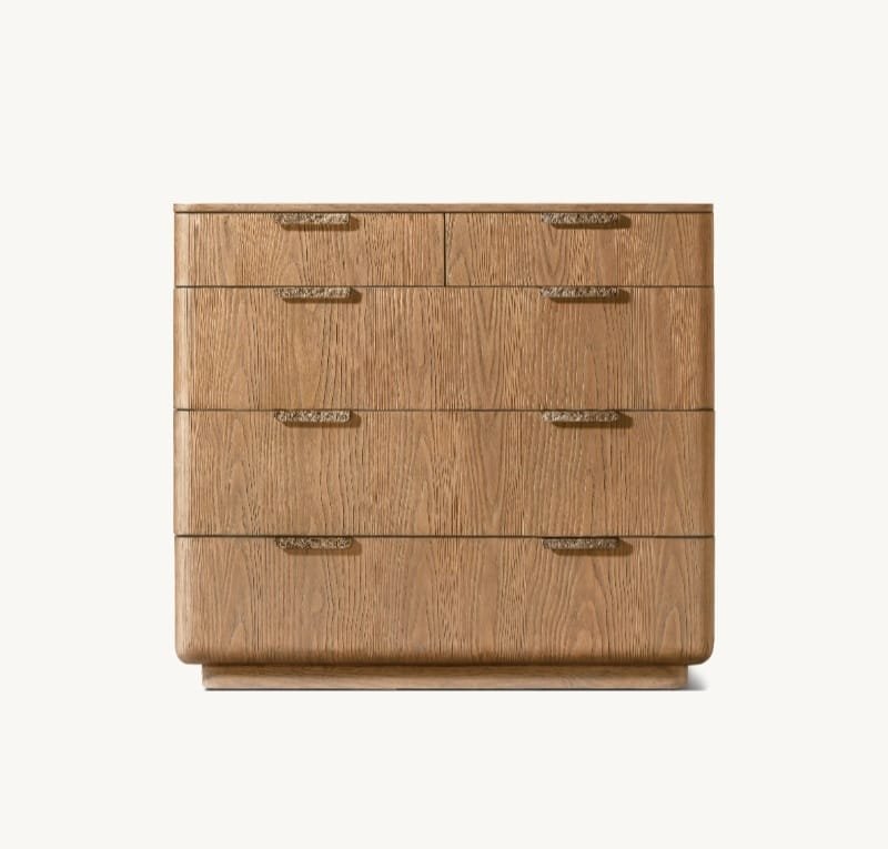 The Charlotte Tall Dresser combines refined craftsmanship with a space-saving vertical silhouette. Featuring five spacious drawers, this elegant piece is crafted from solid wood and veneer with a distinctive curved base and textured handles, echoing the timeless Charlotte Collection aesthetic. Perfect for bedrooms with limited floor space, it offers generous storage without compromising style.