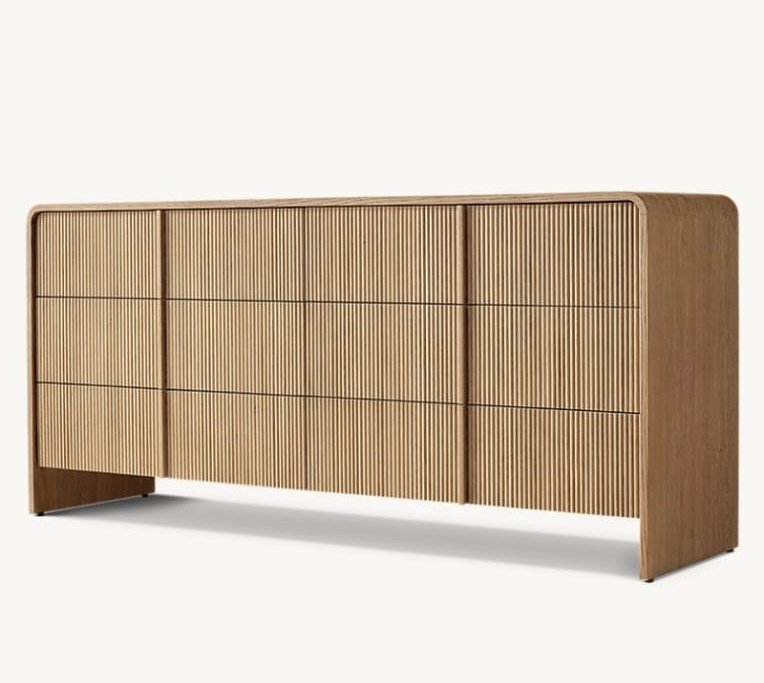 The Cloud Nine Dresser brings effortless sophistication to the bedroom with its fluted wood façade and gently rounded silhouette. Crafted from solid Zan wood with natural veneer, this piece perfectly balances modern elegance and warm texture. Its generous six-drawer design provides ample storage while maintaining a sleek, refined look.