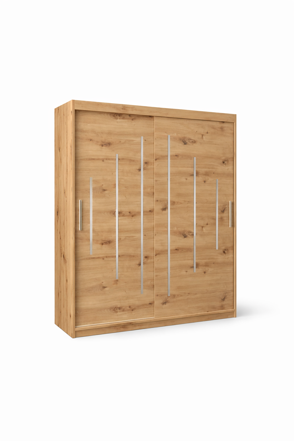 The Conrad Wardrobe is a modern sliding wardrobe that combines natural wood elegance with contemporary metallic accents. Featuring two wide sliding doors with sleek vertical inlays, this piece adds a stylish, minimalist touch while maximizing storage.