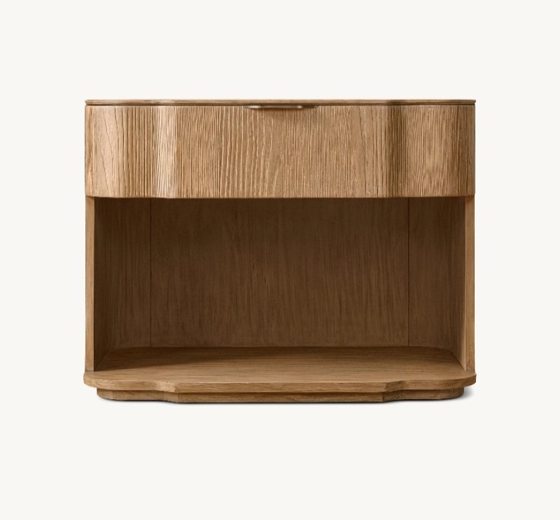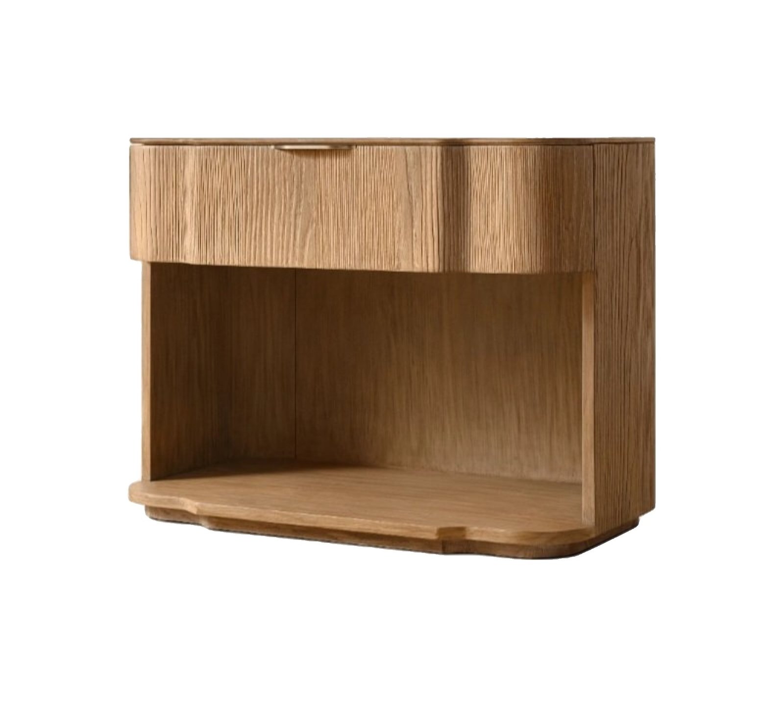 Core Shelf Nightstand is designed with a solid wooden structure, a smooth top drawer, and an open lower shelf for easy-access storage. Its curved edges and clean form make it perfect for modern and natural-style bedrooms, offering both hidden and open storage in one compact piece.