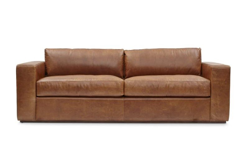 A modern dark sofa upholstered in leather, designed with clean lines and generous proportions for timeless comfort and durability.