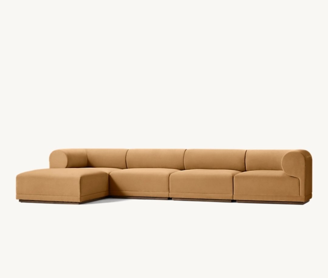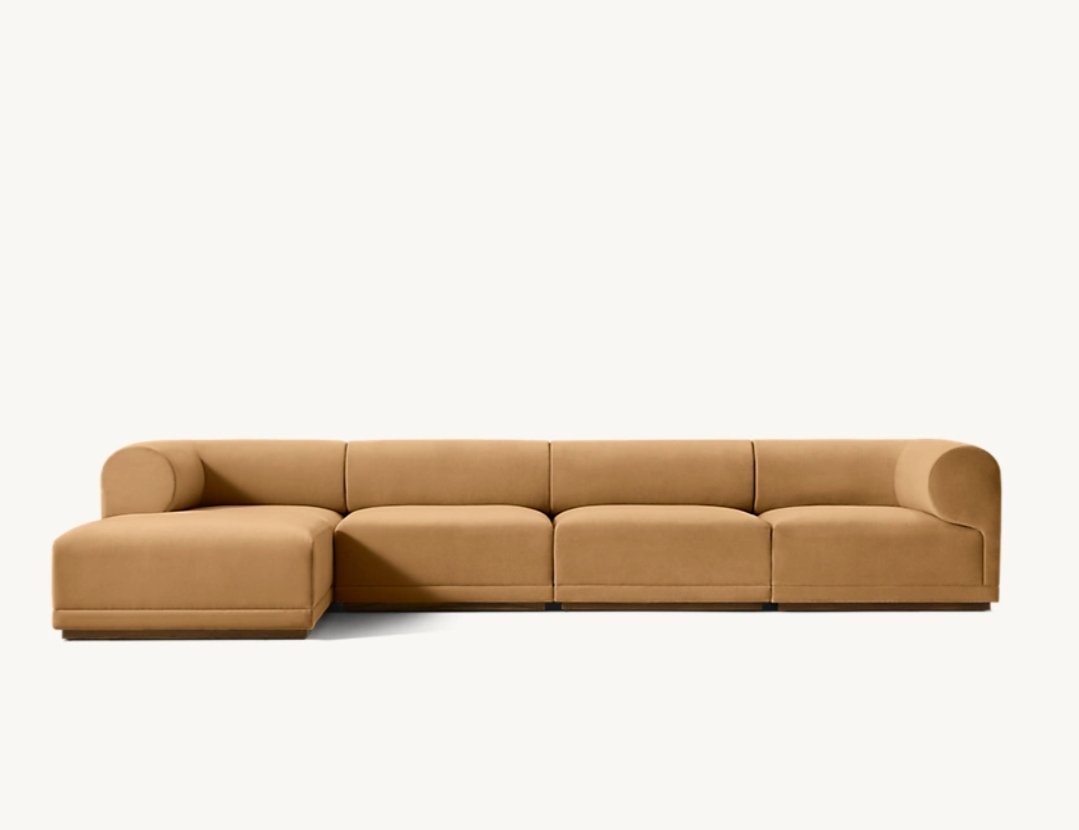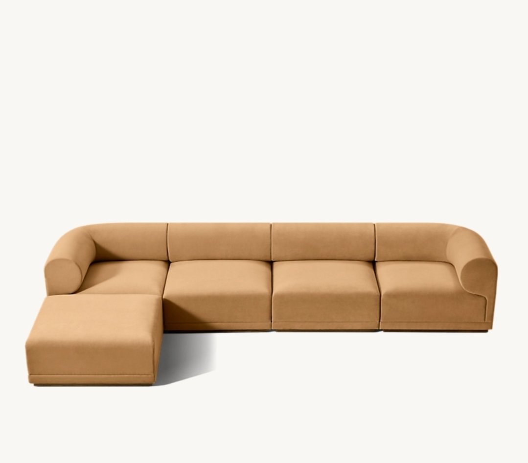 Its modular layout allows flexibility in configuration, making it ideal for spacious living rooms and open-plan homes. The rounded backrest and plush seat cushions provide a deep, supportive lounging experience, while the seamless upholstery enhances the sofa’s calm, uninterrupted silhouette.