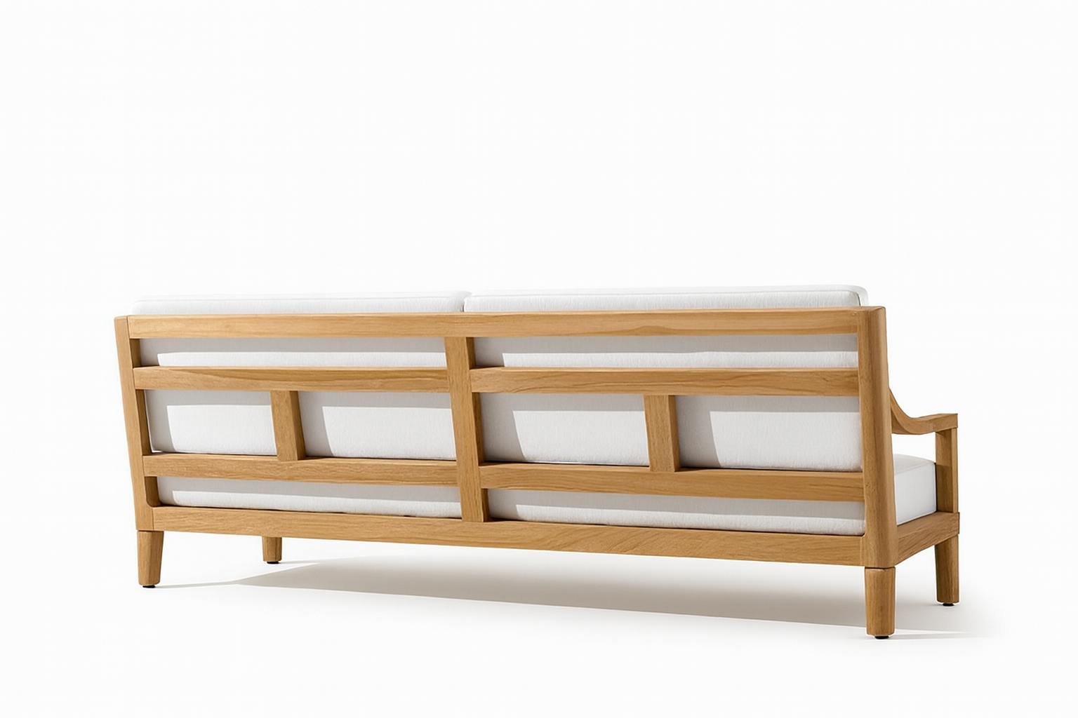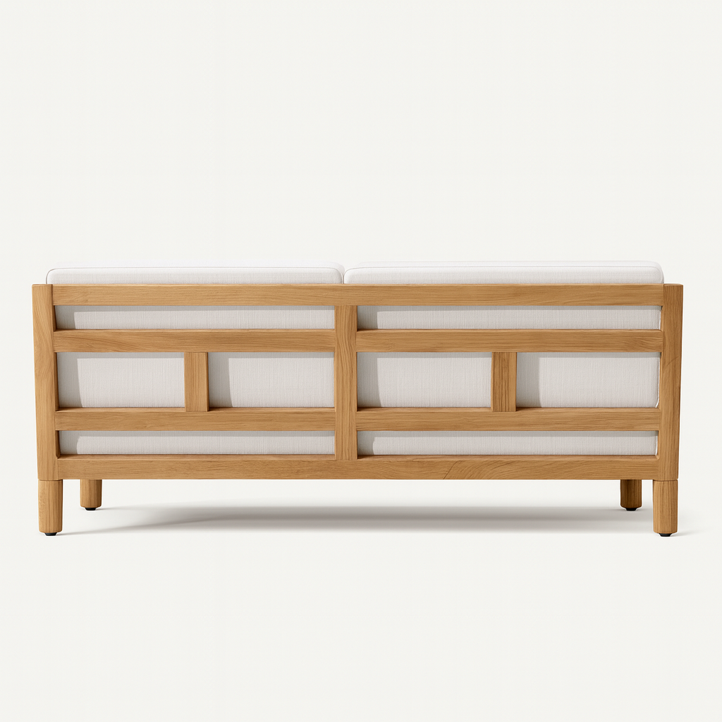 Upholstered in premium outdoor performance fabric, the seat and back cushions offer a plush, supportive feel while being durable enough for both indoor and covered outdoor use. The clean, open structure and refined joinery give the piece a sense of flow — ideal for Japandi, Rustic Contemporary, or Modern Minimalist interiors.