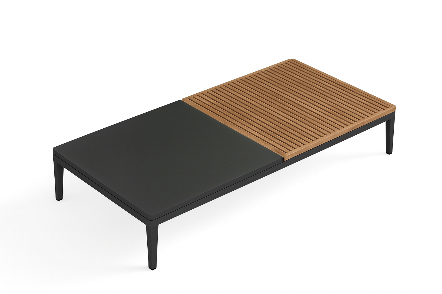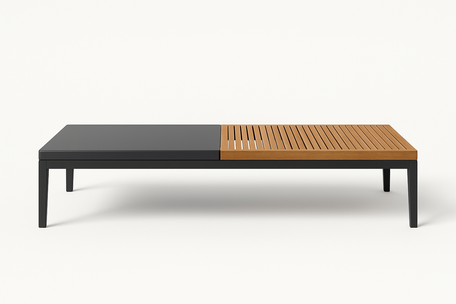 A sleek modern coffee table featuring a dual-surface design — half solid metal and half slatted natural wood. Minimal, durable, and perfect for indoor and outdoor spaces.
