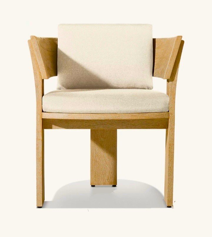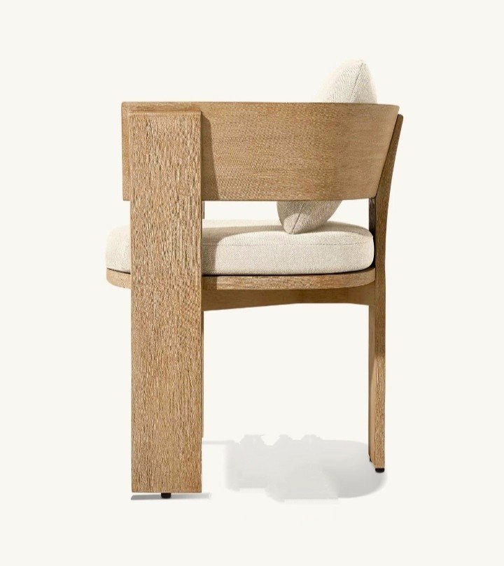 A statement dining chair crafted from massive solid wood with a bold architectural frame and soft outdoor upholstery. Built to last and designed to elevate indoor and outdoor spaces alike.