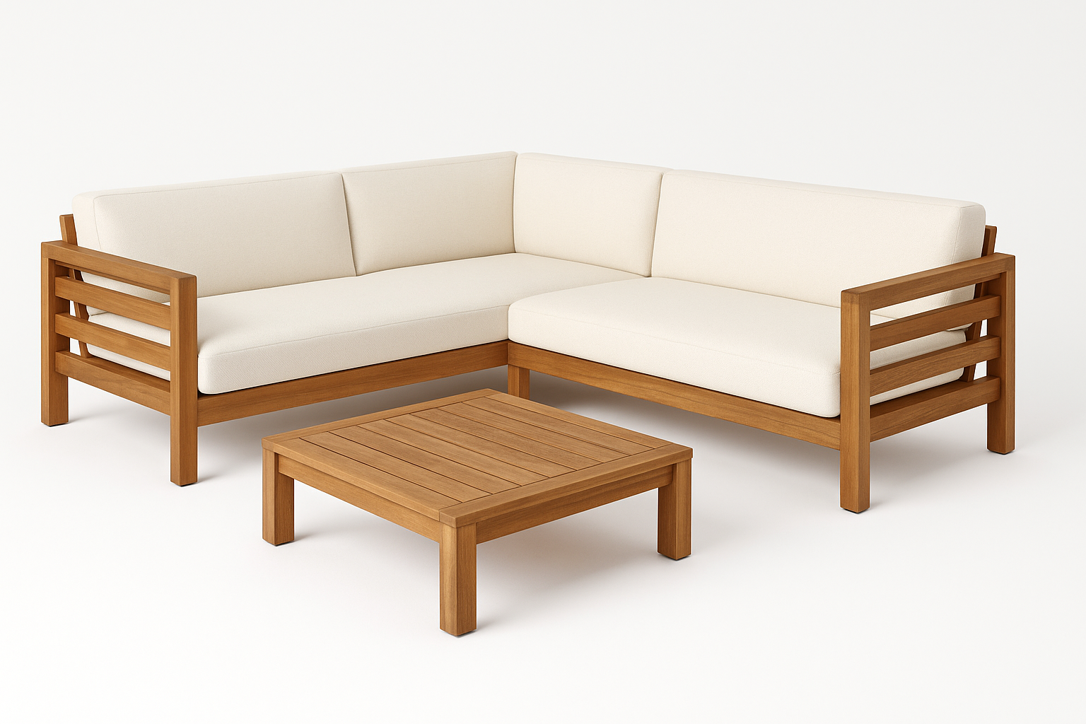 The Grove Sectional Sofa Set blends clean architectural lines with the warmth of solid wood. Complete with a matching coffee table, it’s the perfect centerpiece for terraces, patios, or poolside spaces — designed for comfort, durability, and timeless outdoor style.