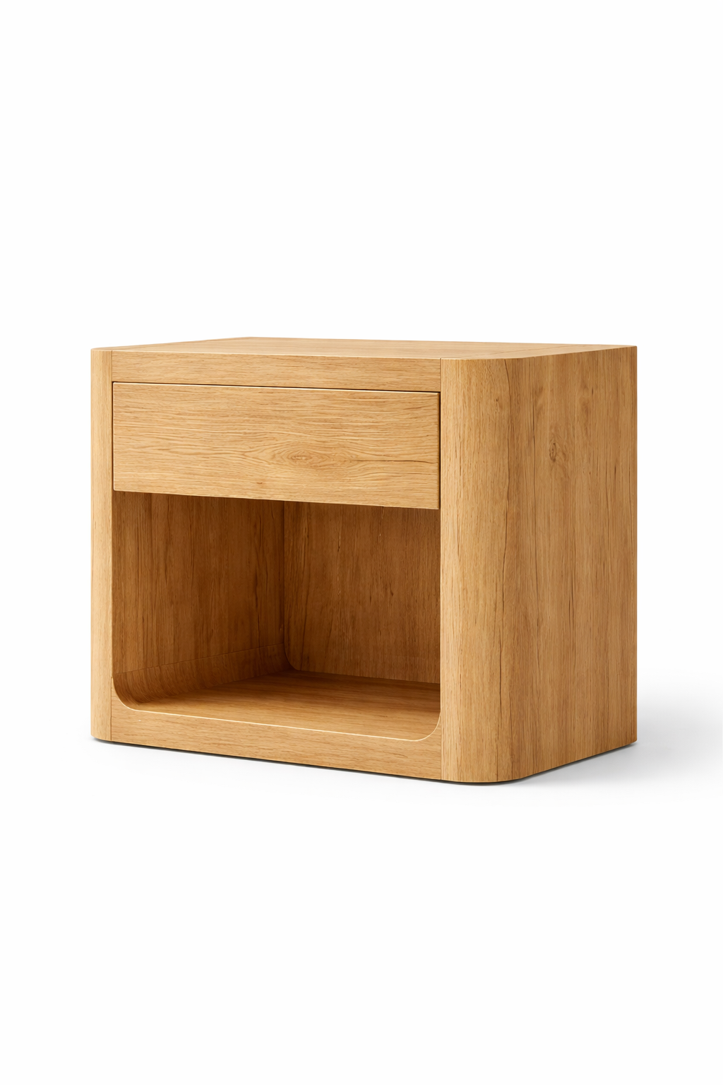 Minimalist Boho-Chic Open Nightstand (50×50cm) crafted from blockboard wood with oak veneer. Functional open design with customizable finishes.