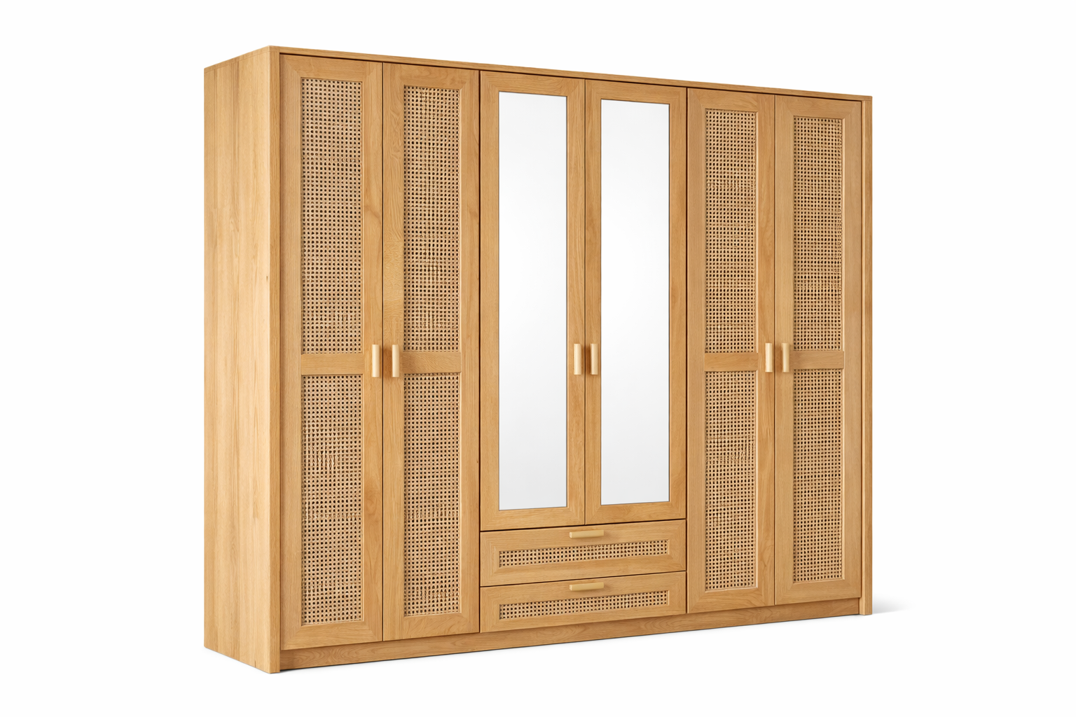 The Cane Wardrobe is the ultimate storage solution that brings natural elegance to your bedroom. Handcrafted from solid Zan wood, blockboard, and premium oak veneer, it features woven natural cane panels that highlight a timeless bohemian design.