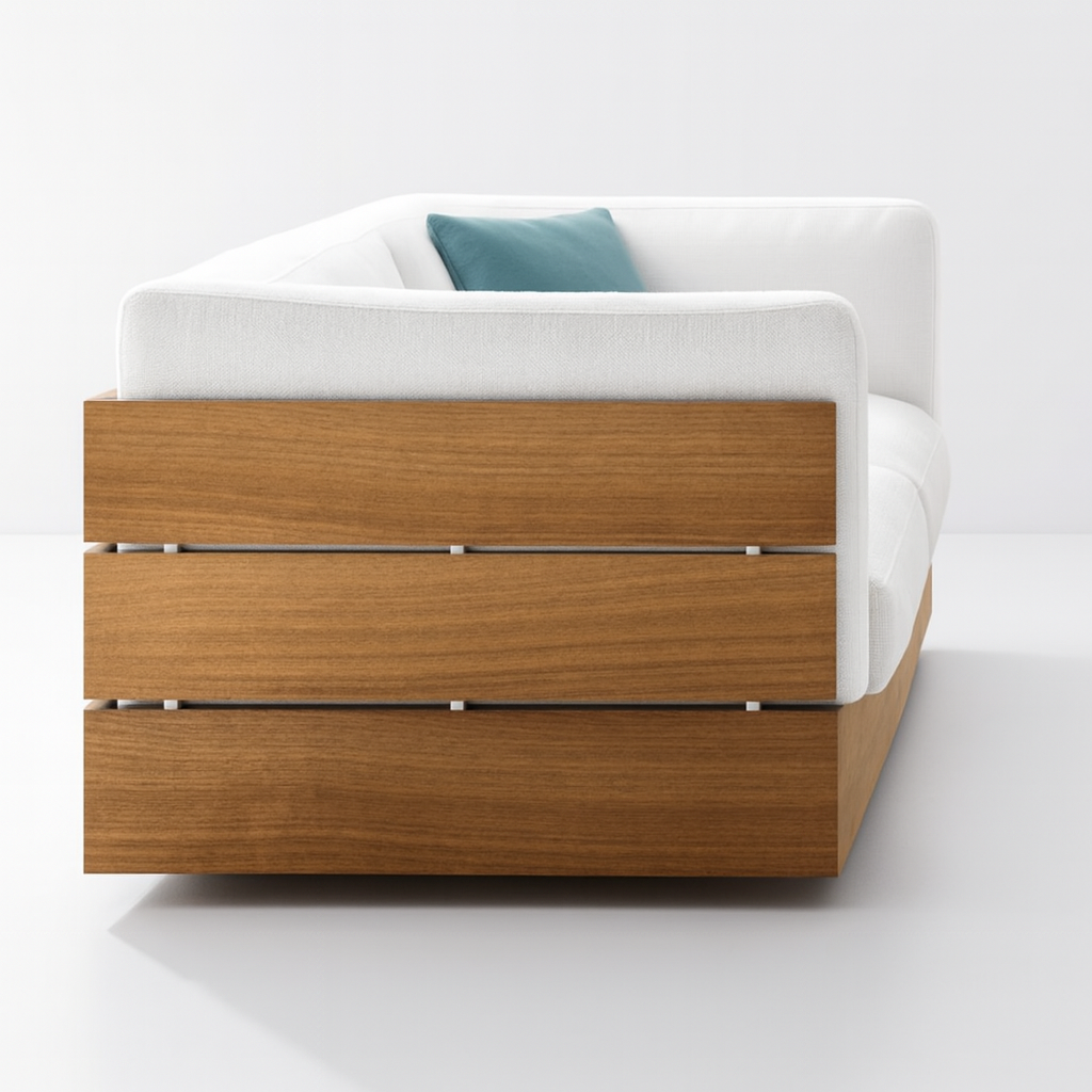Available in Mosky, Pitch Pine, or Teak wood upon request, and customizable in finish, fabric, and size. Whether styled for a sleek city apartment or a serene coastal home, the Italy Sofa makes a timeless statement of understated luxury.