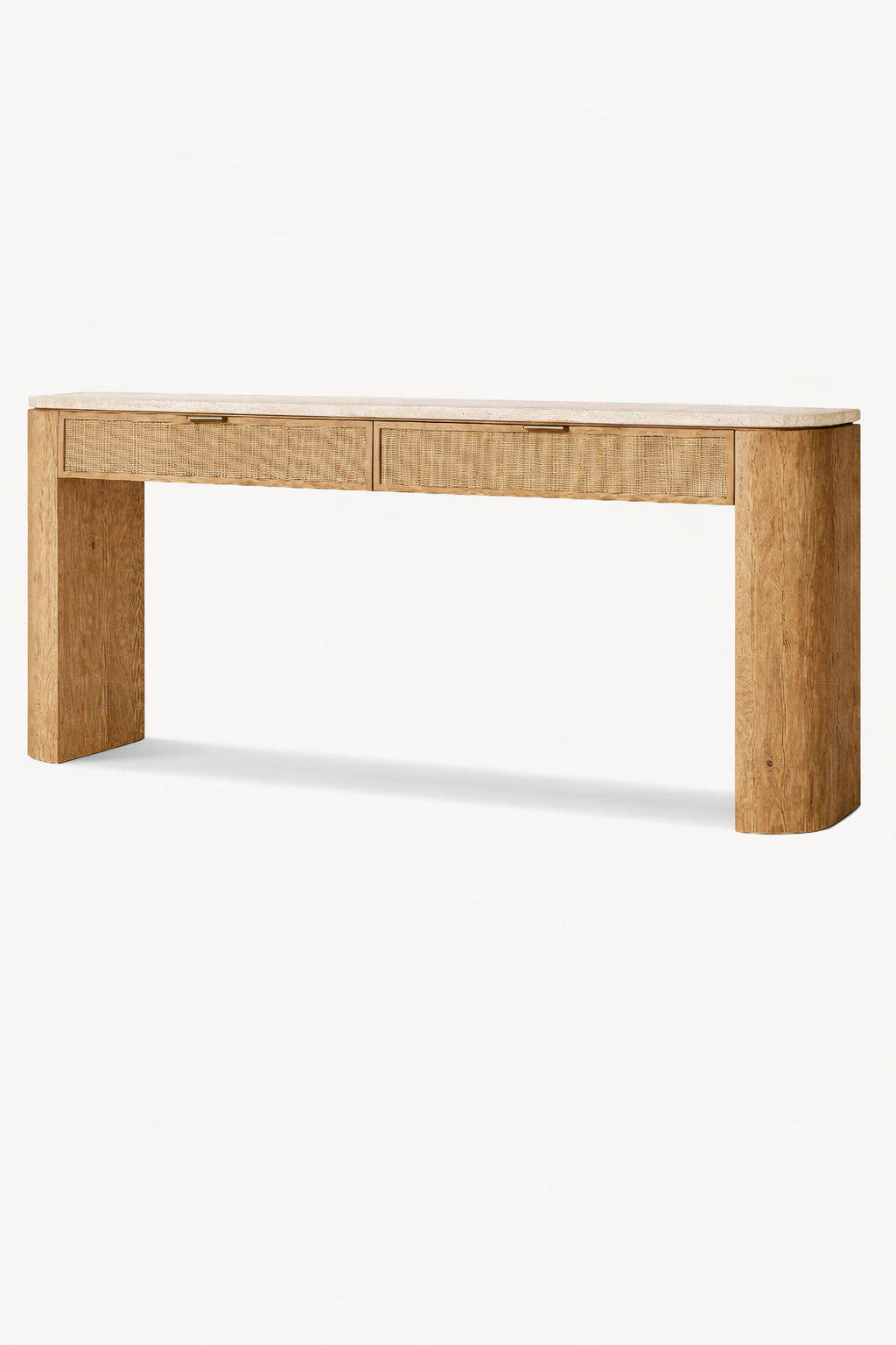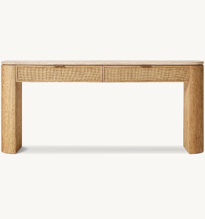 The Kesto Console Table is a perfect balance between softness and strength. With its thick solid legs, slim top profile, woven cane drawer fronts, and natural stone surface, Kesto brings calm luxury into everyday spaces.