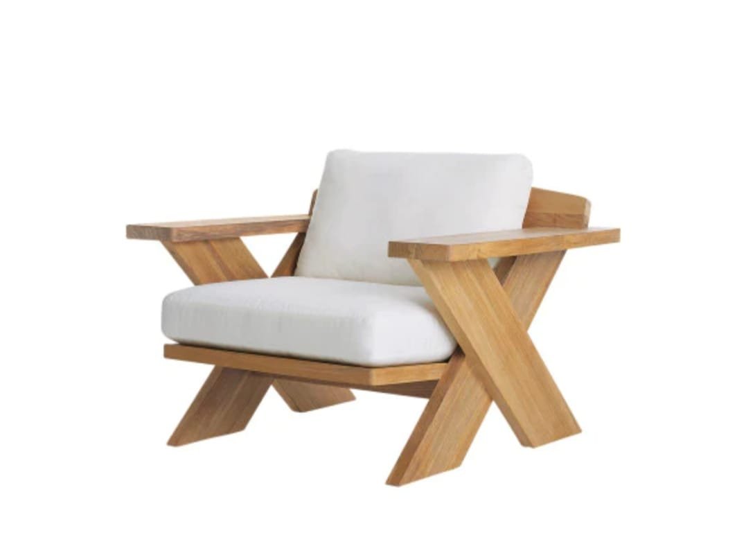 The Kiss Cross Chair is a statement piece that merges architectural geometry with inviting comfort. Its distinctive X-shaped base and arm structure are handcrafted from massive solid wood, creating a bold, sculptural presence in any space.