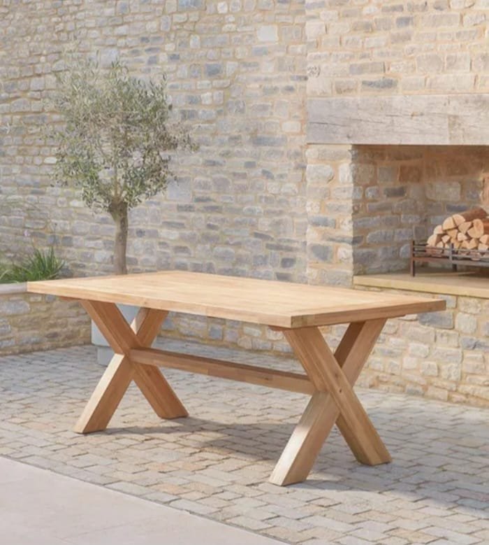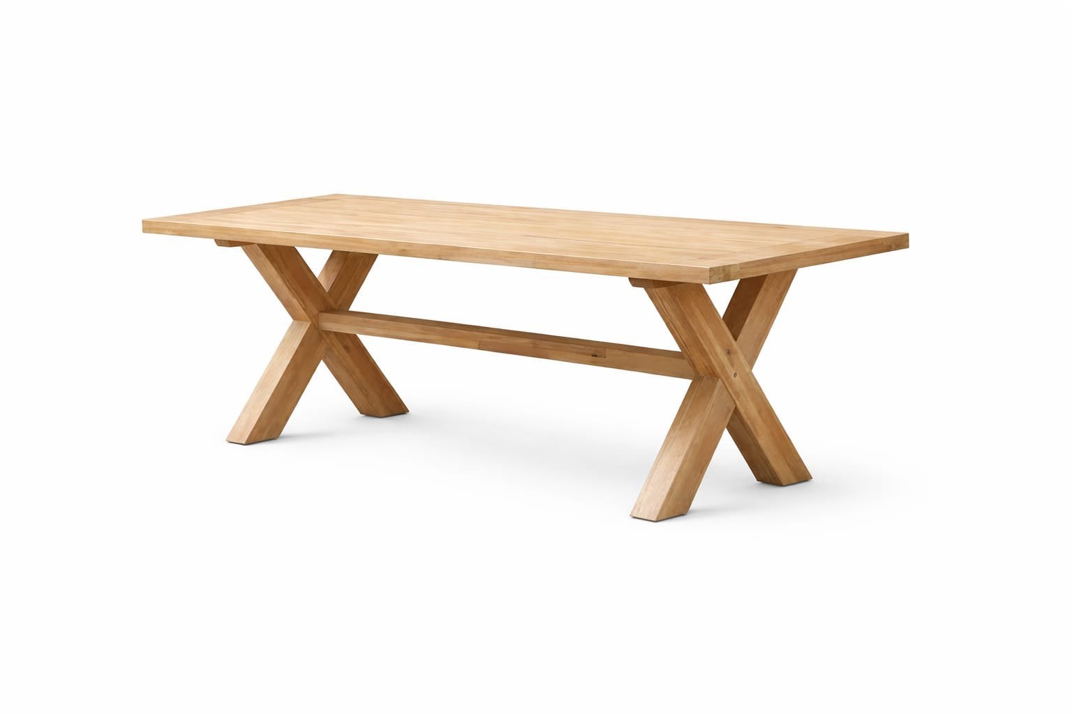 Kiss Cross Dining Table features a bold cross-leg base and clean natural wood top. Strong, modern, and fully customizable in size and finish.