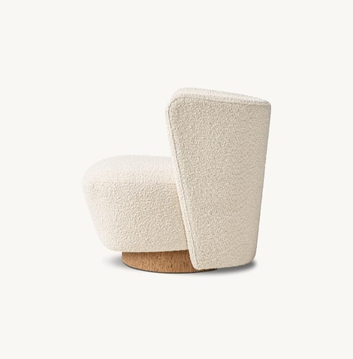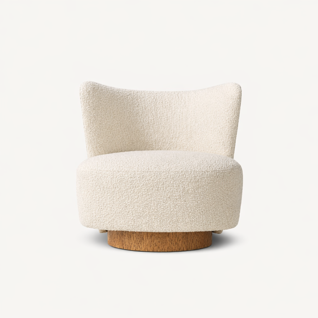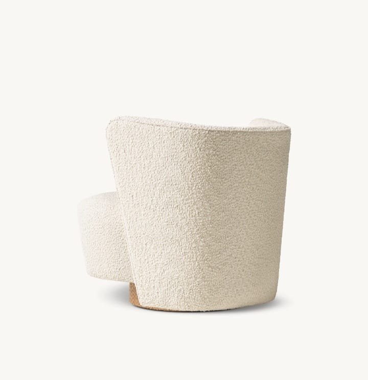 Its rounded seat and supportive backrest create a cocoon-like seating experience, ideal for lounging, reading, or relaxing. The subtle wooden base adds a natural contrast to the upholstered body, grounding the design and enhancing its architectural presence.