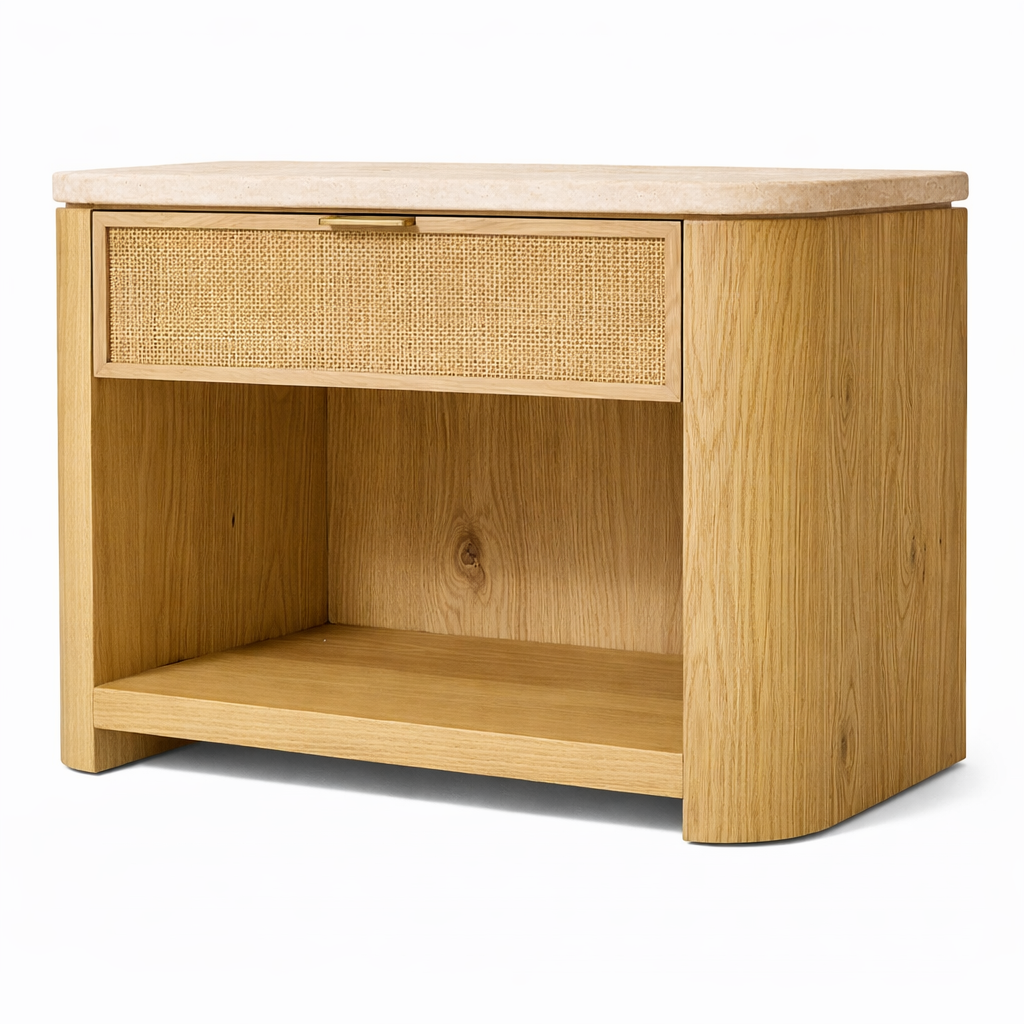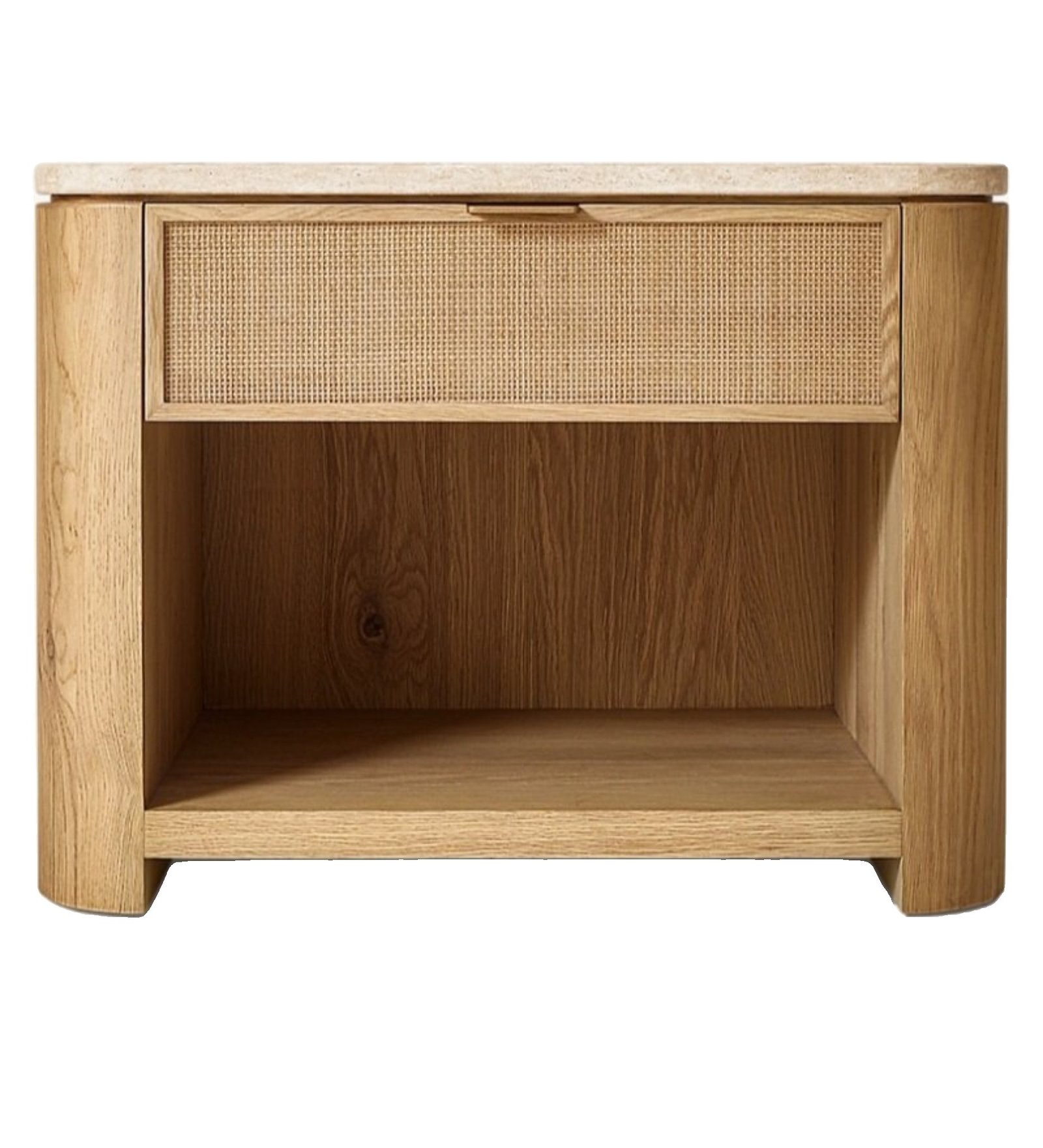 Lexham Open Nightstand is designed for practical bedside storage with a lighter, more open look. It features a solid wooden body, a natural cane drawer front, and a smooth travertine stone top. The open lower shelf allows quick access to books, baskets, or décor items. Available in multiple colors to fit modern, coastal, or natural bedroom styles.