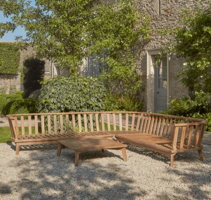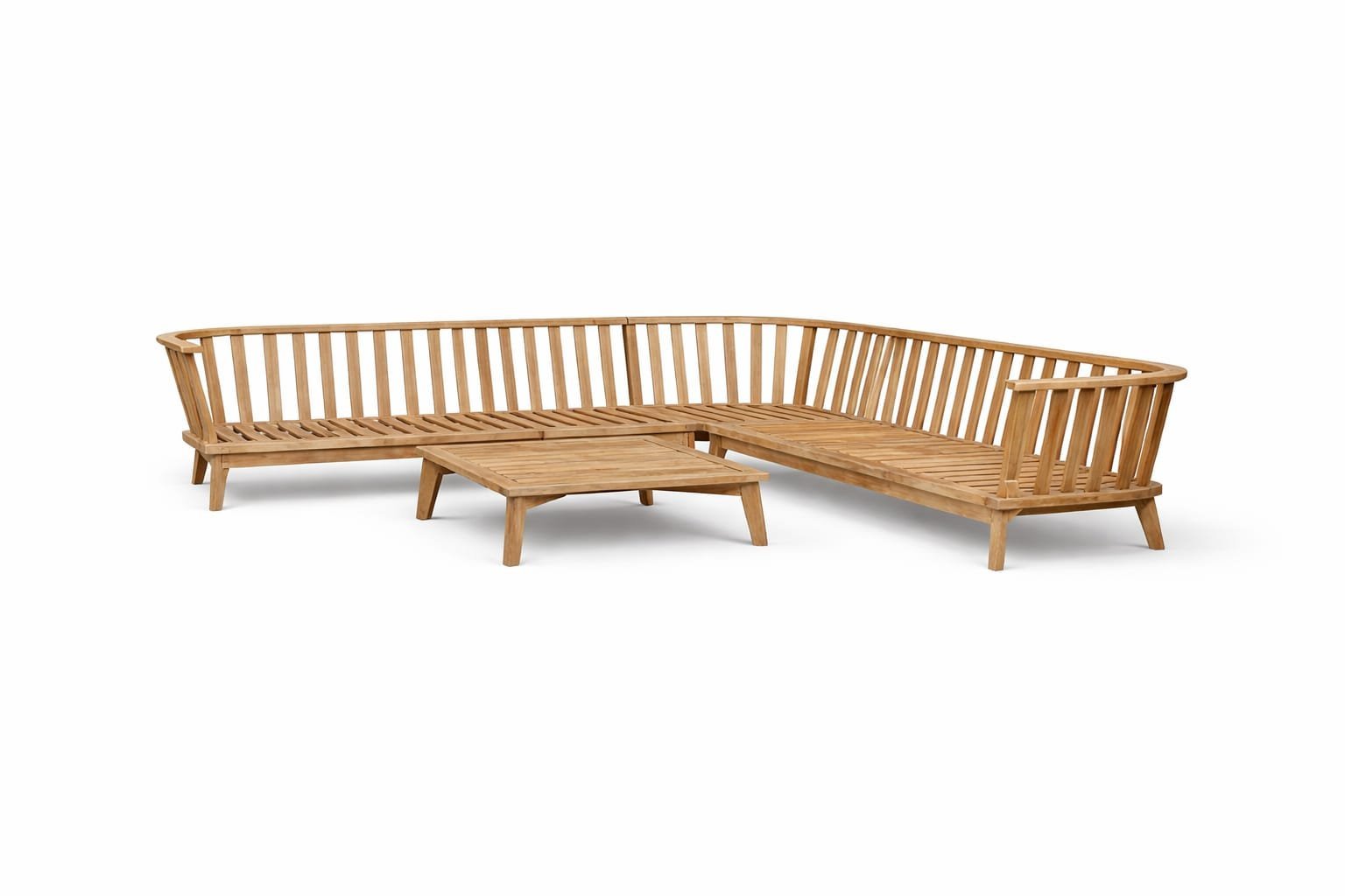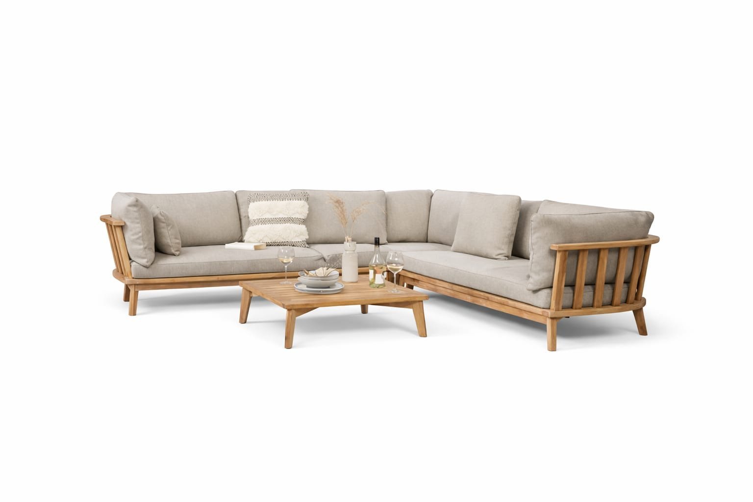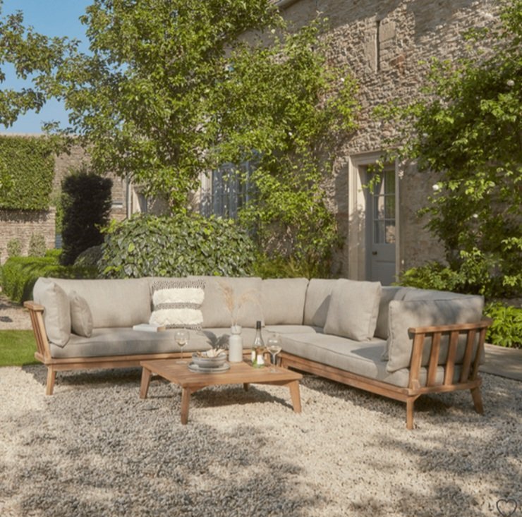 Mare corner set with natural wood frame, weather resistant fabric cushions, and matching coffee table