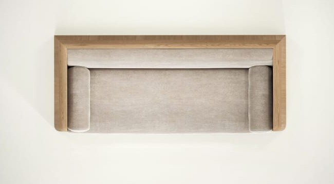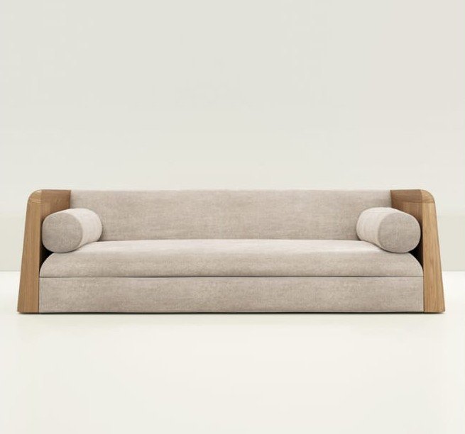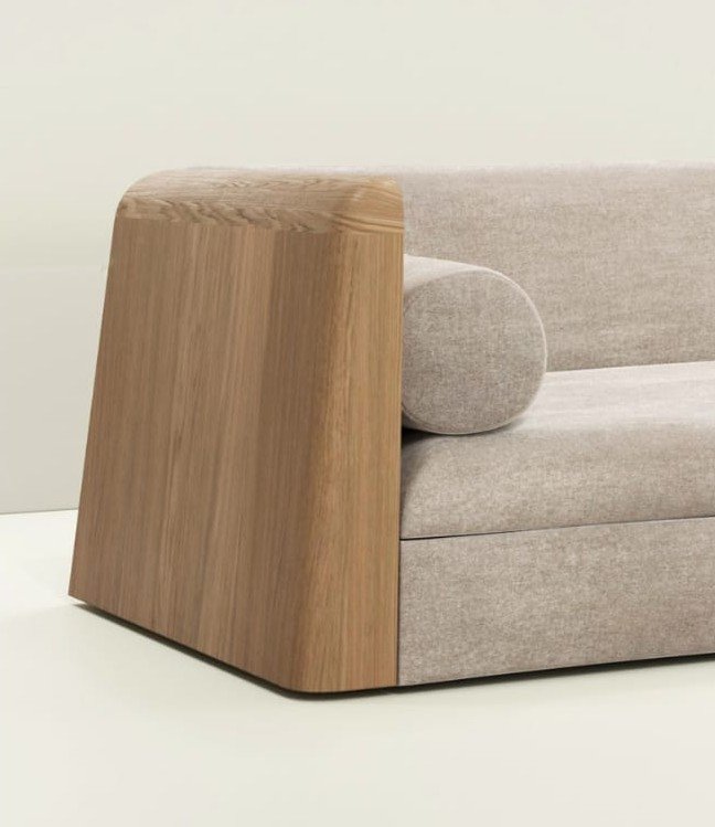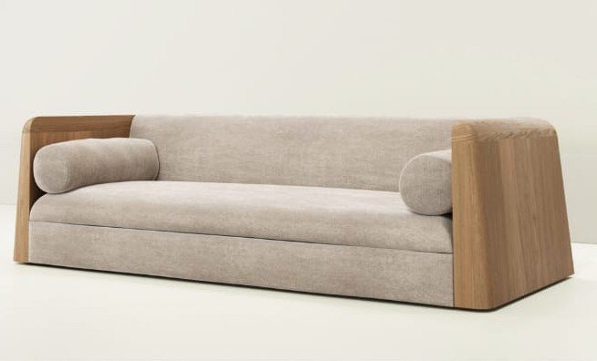 Matter sofa with solid wood side panels and upholstered seating in a modern Japandi interior style