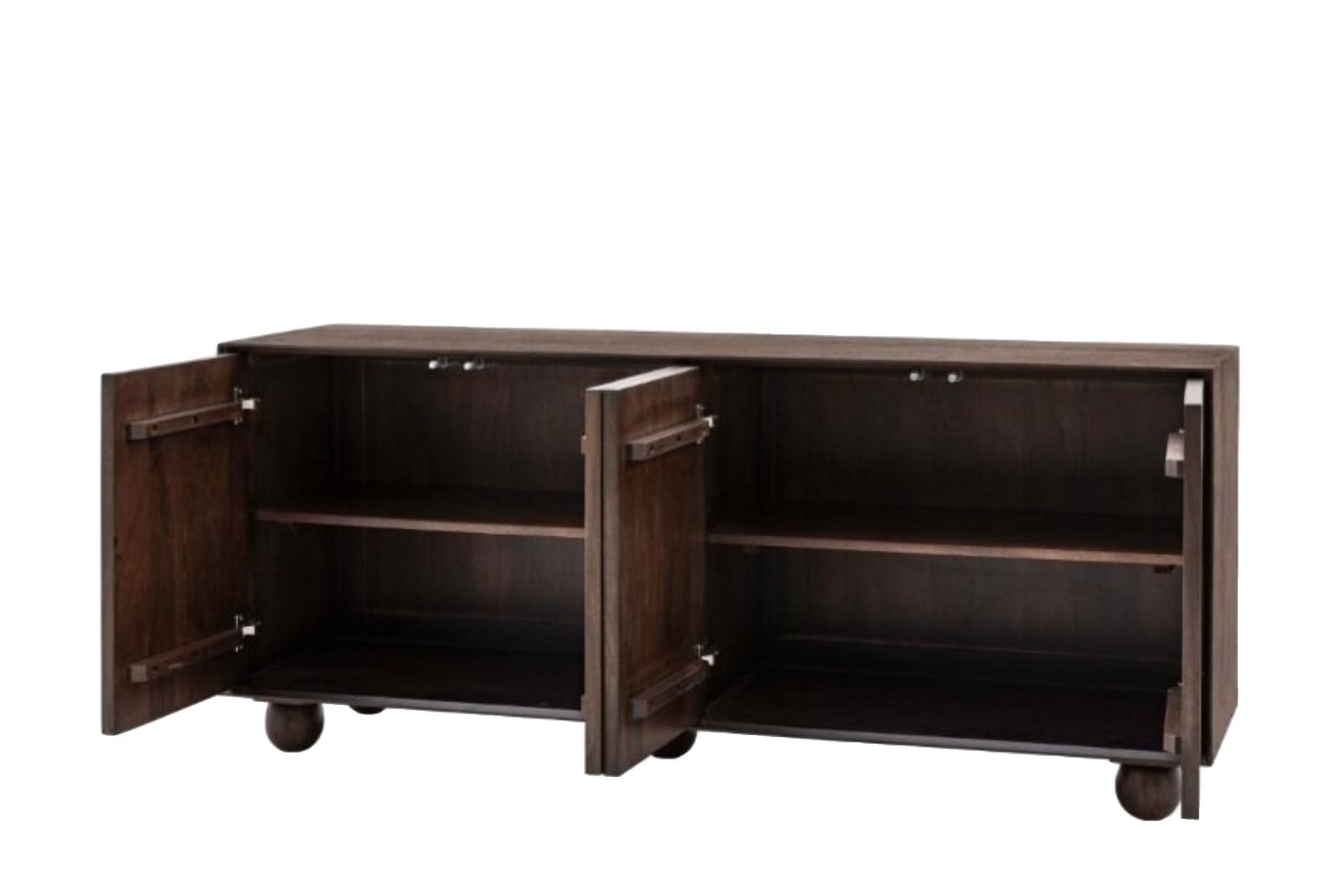 Its wide structure provides generous storage for dining rooms, living rooms, and open spaces, while the smooth wooden finish gives warmth and depth. The rounded legs lift the piece slightly, creating a light and balanced look.