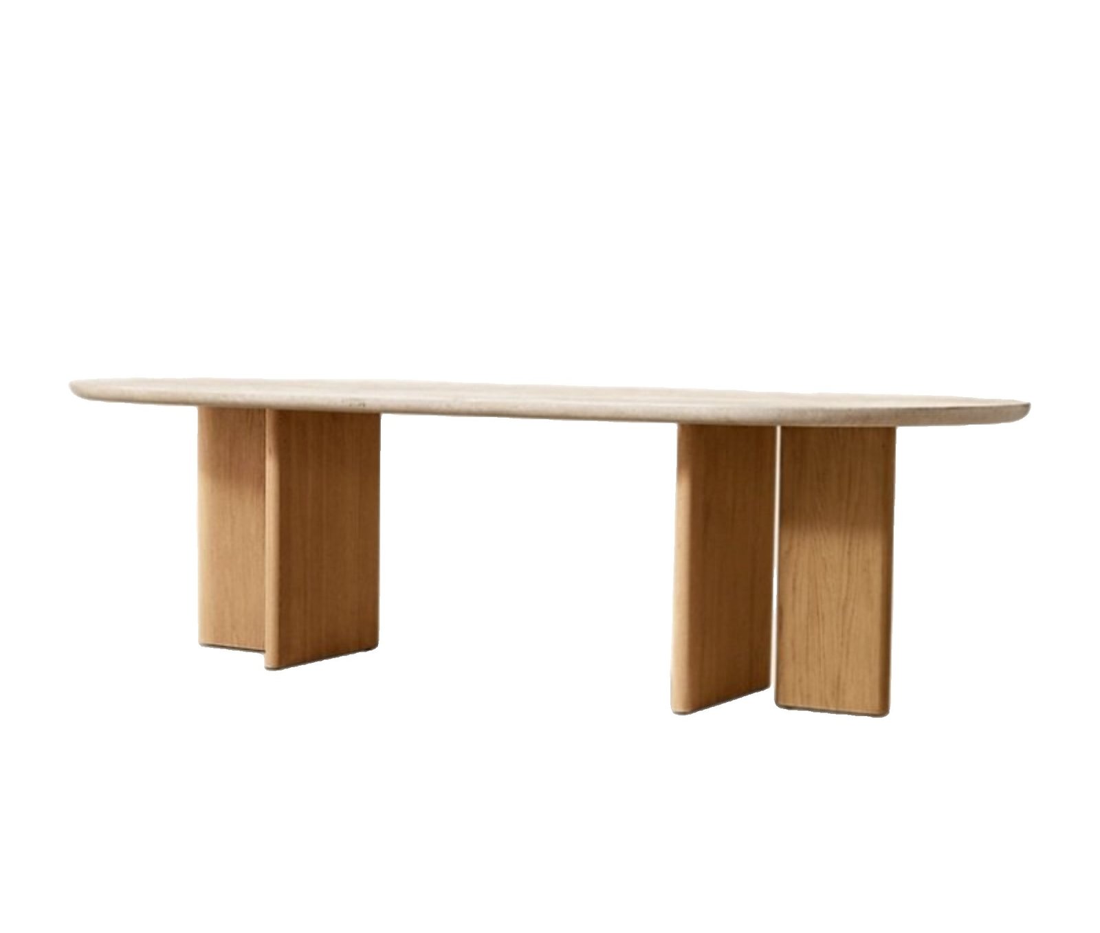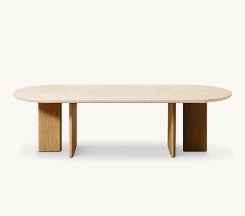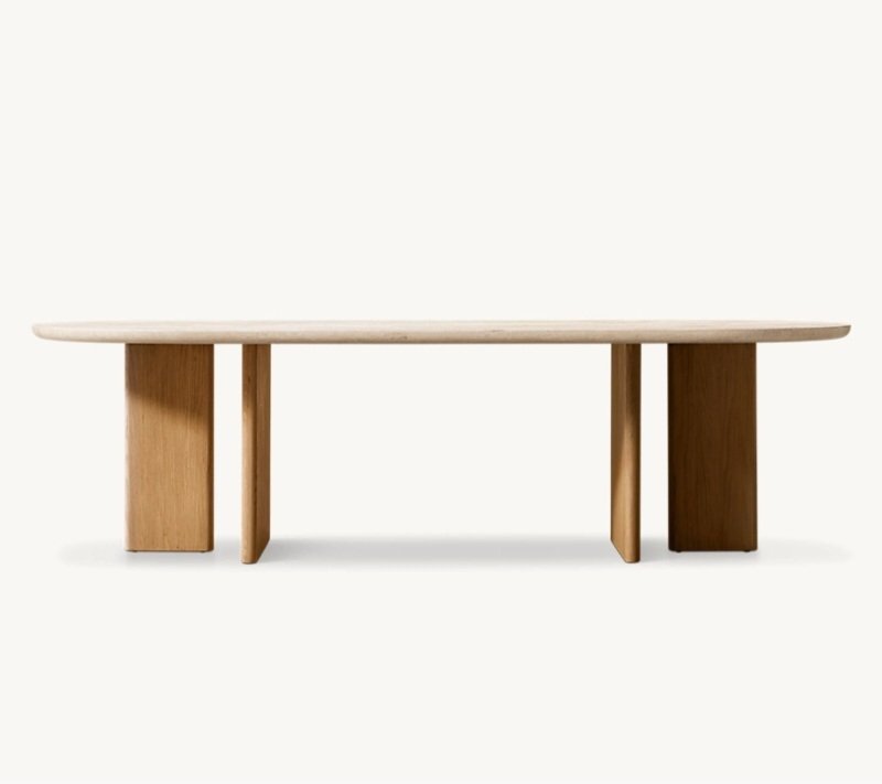 Mercer Dining Table combines a refined natural tavertine stone top with a strong blockboard wood structure finished in natural oak veneer. Its clean lines and solid form make it ideal for modern, minimal, and natural-style dining spaces. Designed to balance durability with timeless elegance.