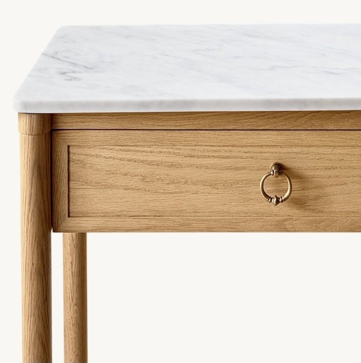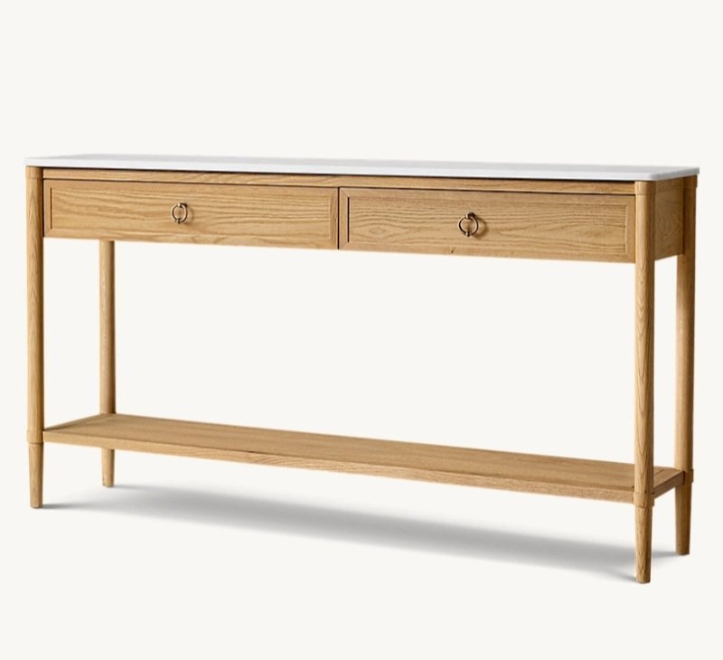 A slim console table made from natural wood with a natural marble top, two drawers, and a lower shelf—designed for elegant everyday living.