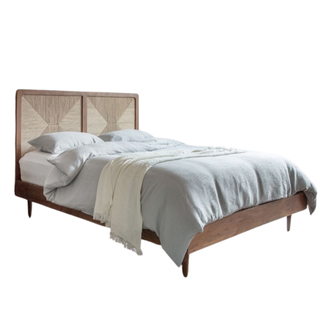 The headboard is a true work of art — hand-woven from natural rope fibers (sisal/jute) in a refined geometric pattern, creating both a tactile and visual statement. This unique combination of wood and woven textures brings warmth, authenticity, and timeless character to any space.