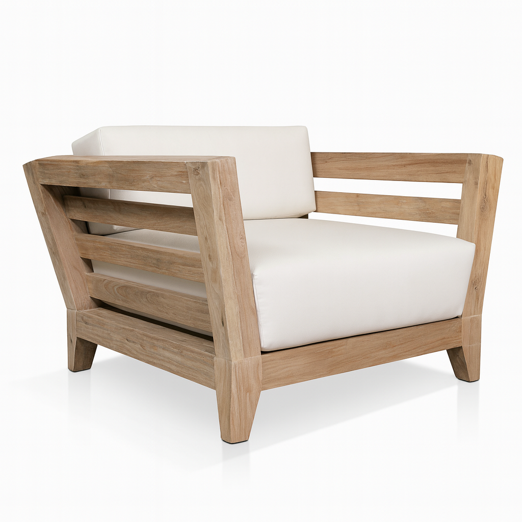 The generously cushioned seat and back are upholstered in premium outdoor performance fabric, offering durability and comfort whether placed in a shaded patio, a living room corner, or a coastal-style lounge. The clean architectural lines and natural materials make the Orana Chair a timeless accent piece that elevates both residential and hospitality spaces.