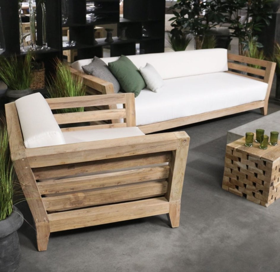 The Orana Sofa is a contemporary wooden sofa crafted in solid Mosky wood, with optional Pitch Pine or Teak wood. It features a structured frame with bold horizontal lines and plush cushions, blending modern elegance with natural warmth. Ideal for both indoor and outdoor spaces.