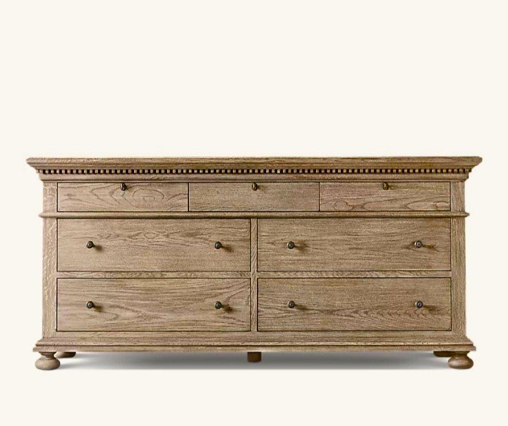 The Oslo Dresser by Cozyology Furniture is a masterpiece of classic craftsmanship and modern luxury. Featuring solid Zan wood with a natural veneer finish, this dresser stands out with its elegant mouldings, decorative edges, and vintage-inspired knobs that exude European sophistication.