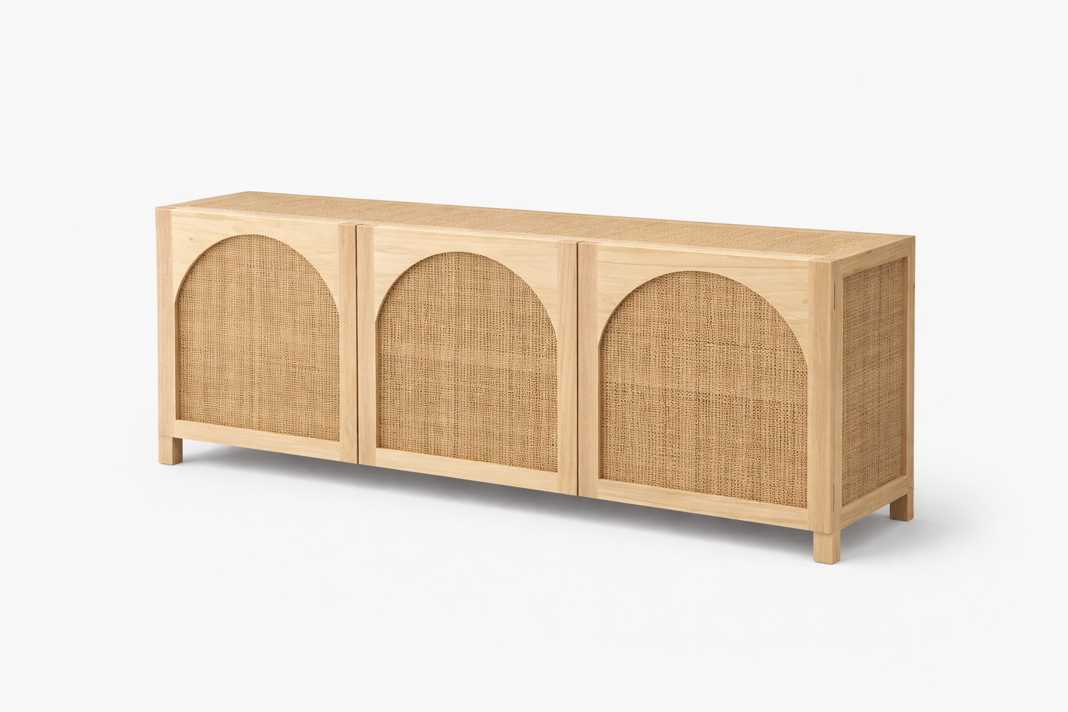 Its arched cane-front doors introduce a soft architectural rhythm while allowing subtle texture to elevate the overall design. Behind the doors, Pavo offers practical internal storage, making it ideal for organizing dining essentials, living room items, or decorative pieces.