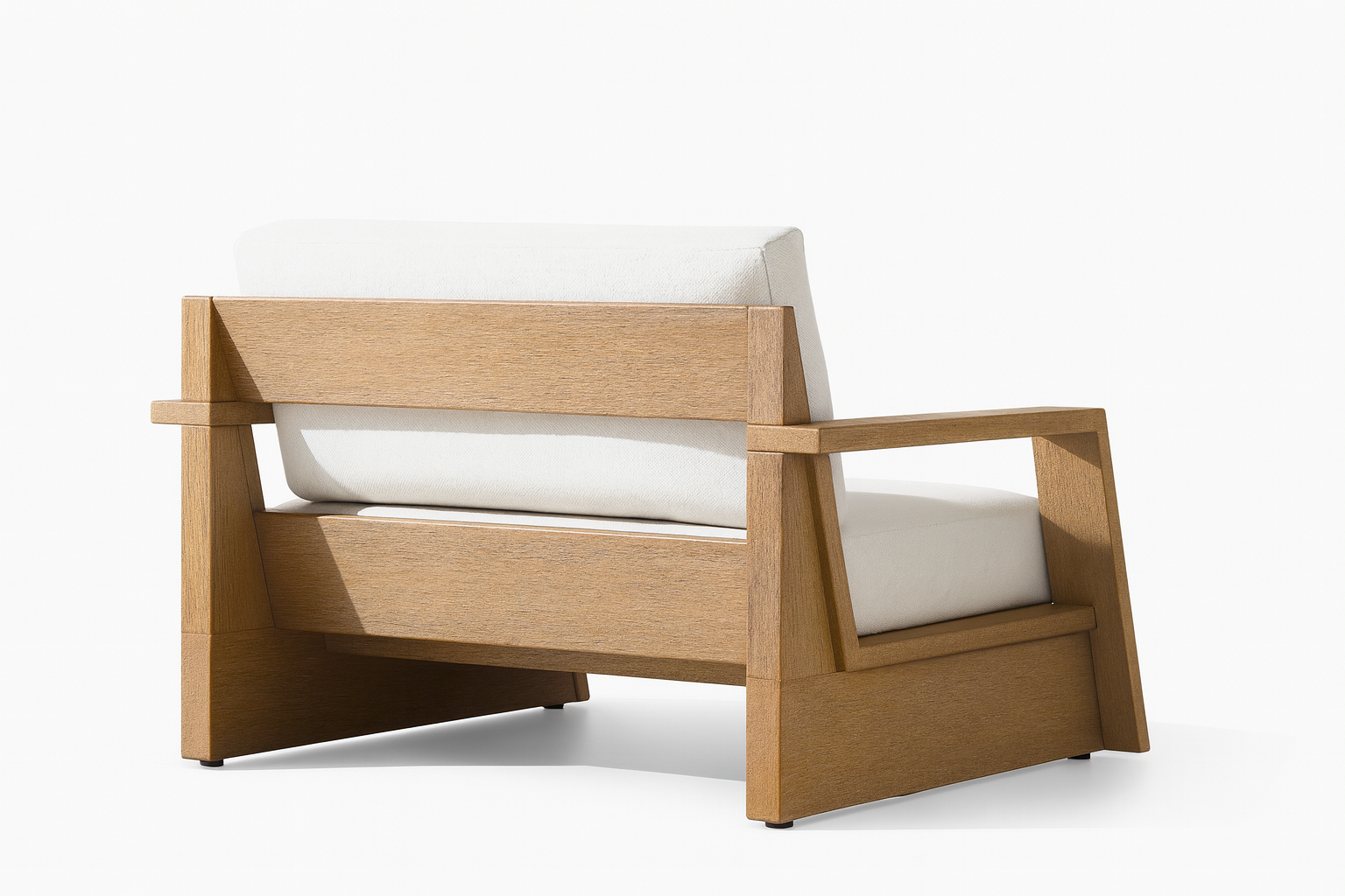 The Railay Chair by Cozyology Furniture Egypt blends bold geometry with understated elegance. Handcrafted from solid Mosky wood, its angular silhouette and sculpted arms offer a unique architectural presence, perfectly balanced by the softness of plush, high-density cushions.