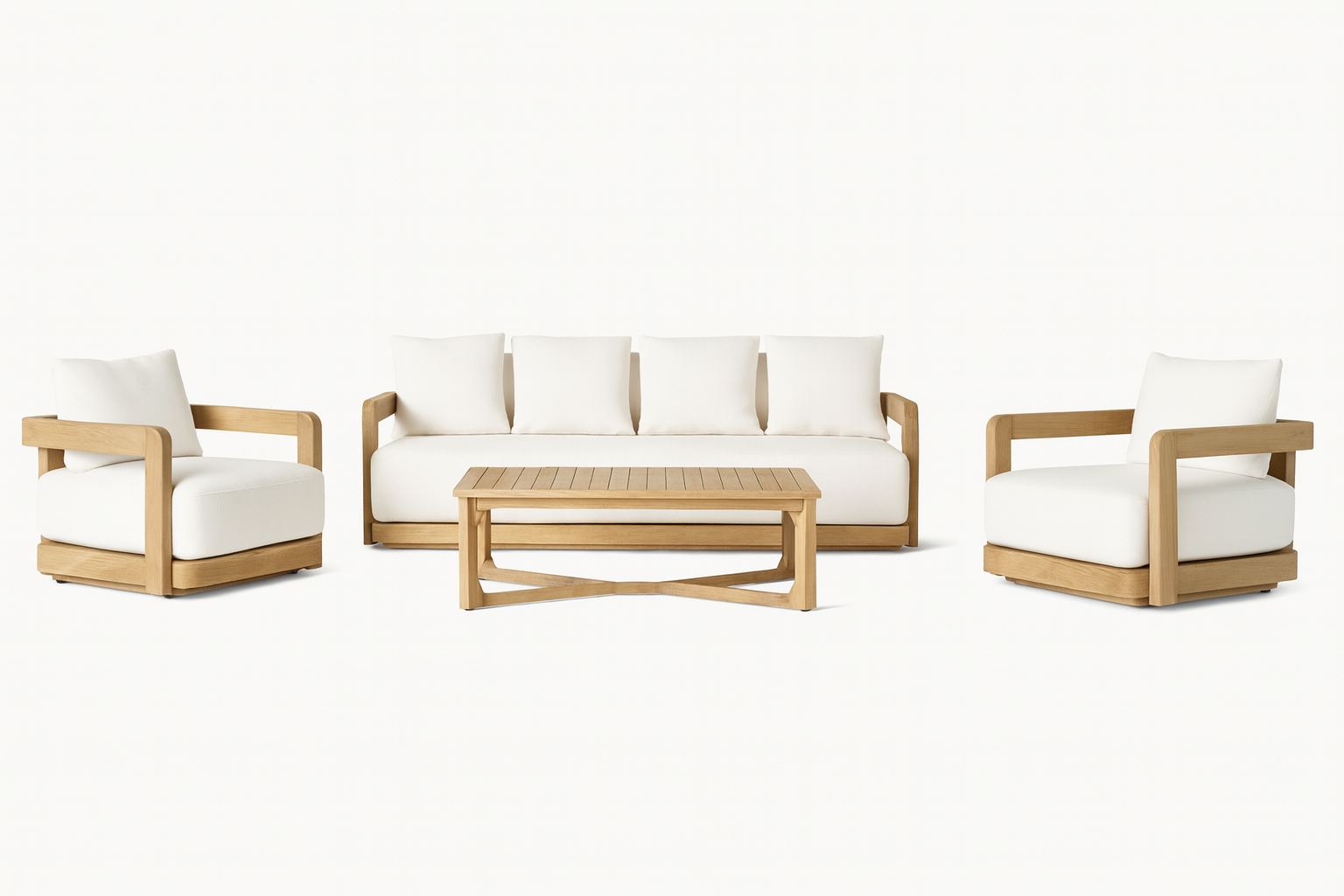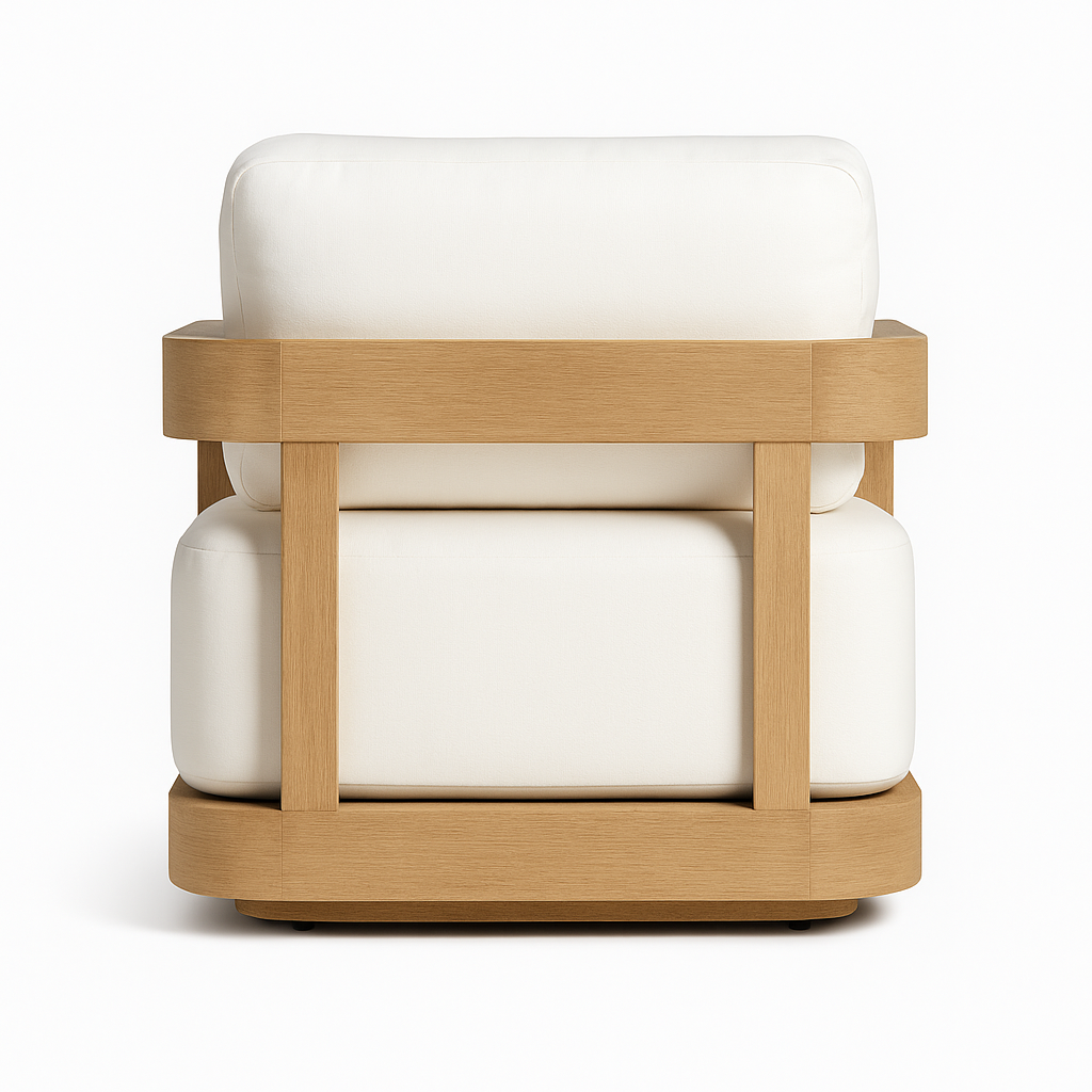 This piece features a bold wooden frame with smooth, curved edges, plush seat and back cushions, and a grounded silhouette that evokes calm and sophistication. Its design reflects Organic Minimalism and Japandi aesthetics, making it perfect for serene living spaces, terraces, or lounges.