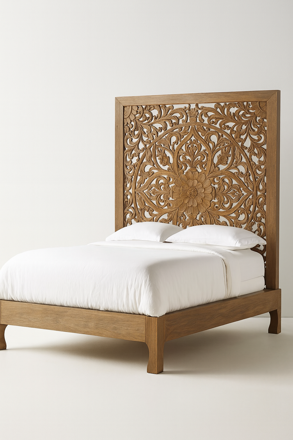 Bring regal elegance to your bedroom with the Royal Bed, a true masterpiece of craftsmanship. Hand-carved from solid wood, this bed features a striking headboard with intricate floral and arabesque patterns, framing your sleeping space like a work of art.
