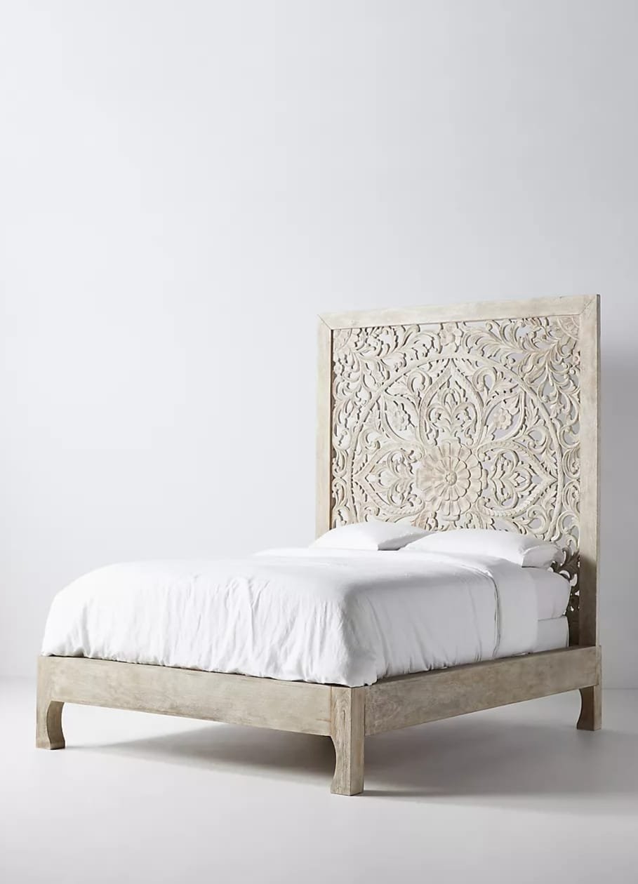 Hand-carved solid wood bed with intricate floral headboard. Available in 160, 180 & 200 cm sizes. A timeless centerpiece for elegant bedrooms.