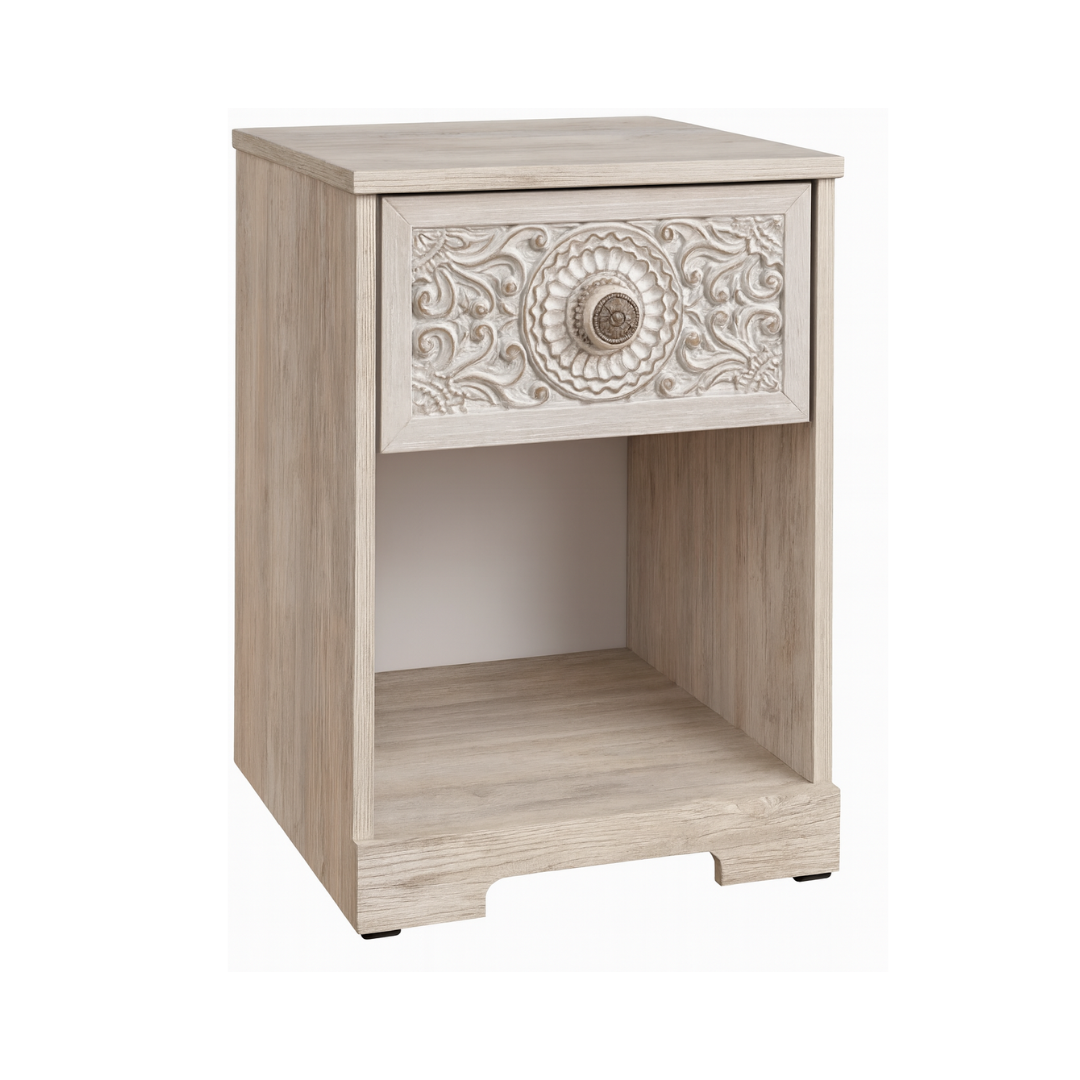 Elegant handcrafted nightstand with carved floral details, 1 drawer + open shelf, in a soft washed wood finish. A perfect blend of function and timeless design.
