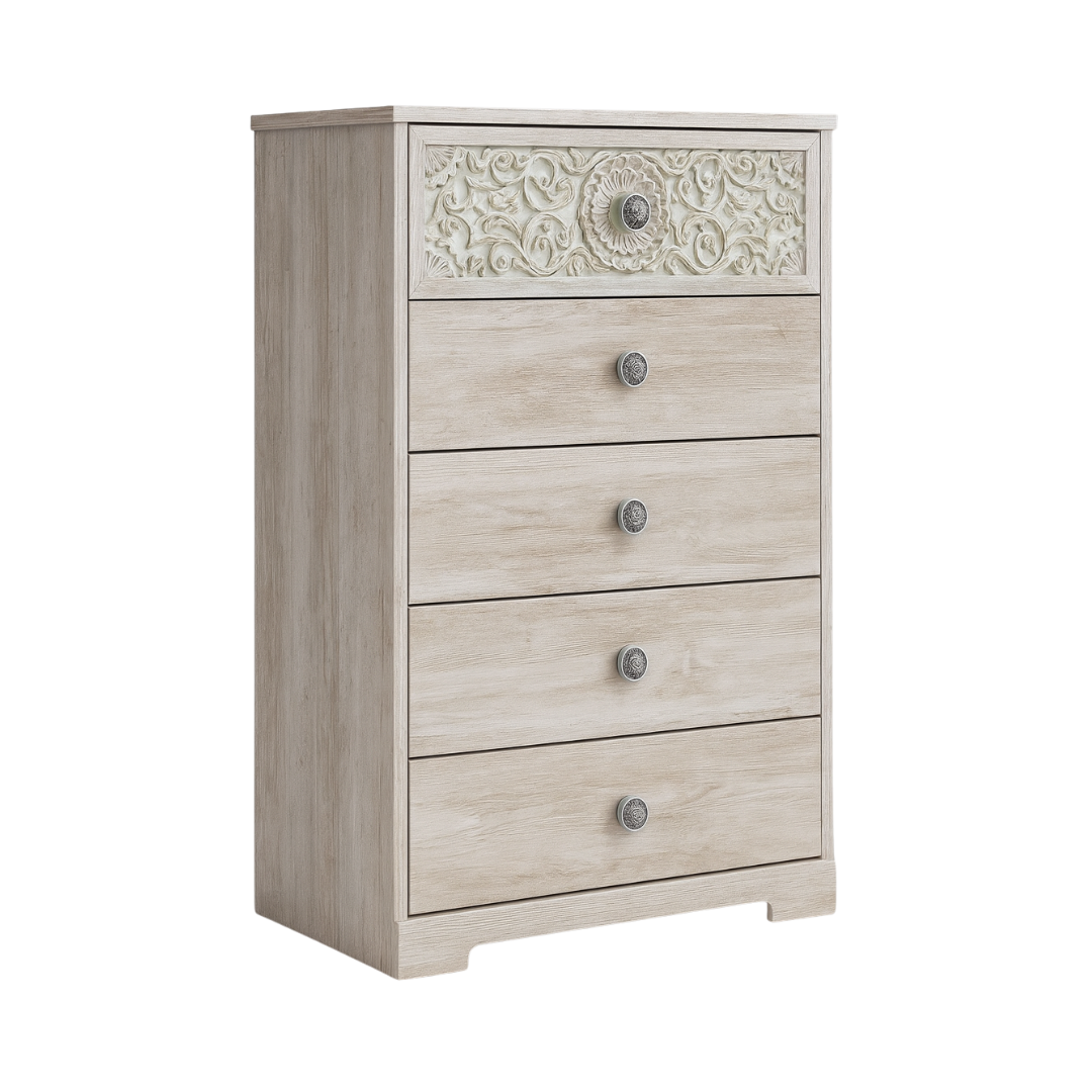 he Royal Tall Dresser is where elegance meets everyday practicality. Crafted from premium solid wood with a soft washed finish, this vertical chest features five spacious drawers, offering generous storage without taking up too much floor space — perfect for bedrooms that need both function and beauty.