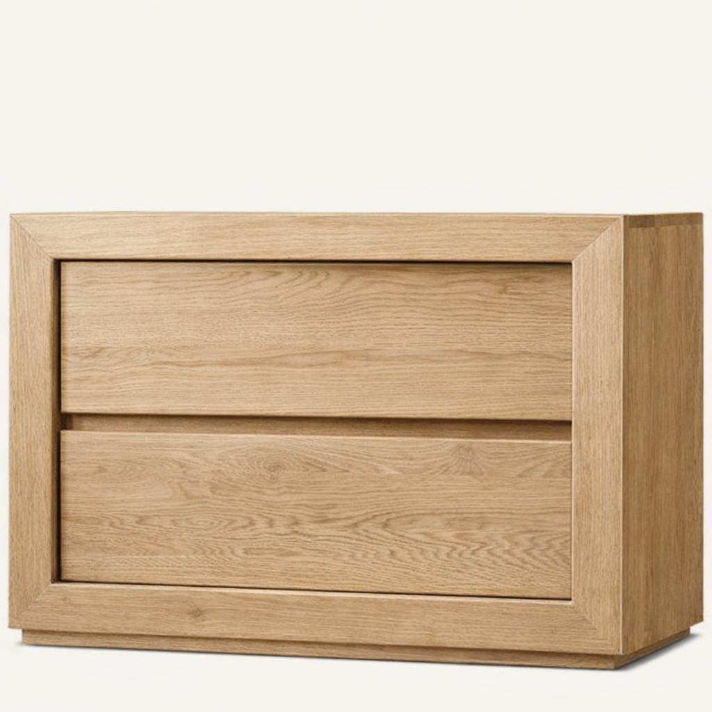 Featuring two spacious drawers and a solid base, this nightstand offers smart bedside storage while maintaining a sleek, grounded profile. Available in multiple wood shades to suit any interior style — from warm natural tones to deep walnut finishes.