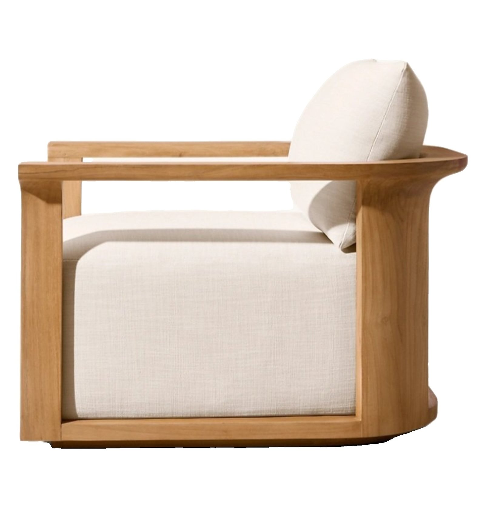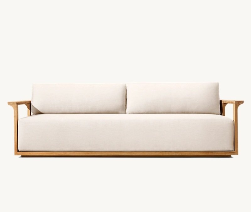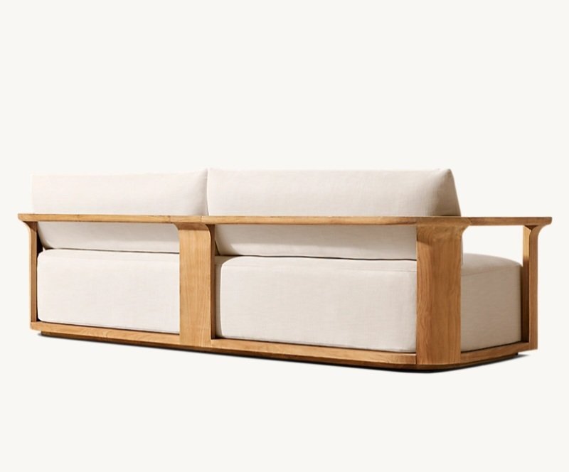 Constructed from solid natural wood, the sofa showcases an elegant open-frame structure with gently curved arm supports that create a light yet architectural appearance. The generous upholstered cushions provide comfortable seating while maintaining a clean minimalist profile.