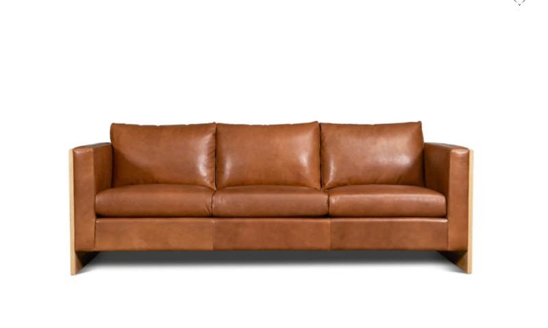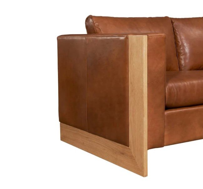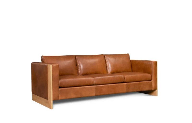 A modern leather sofa with a solid wood frame and clean architectural lines, designed for bold contemporary interiors.