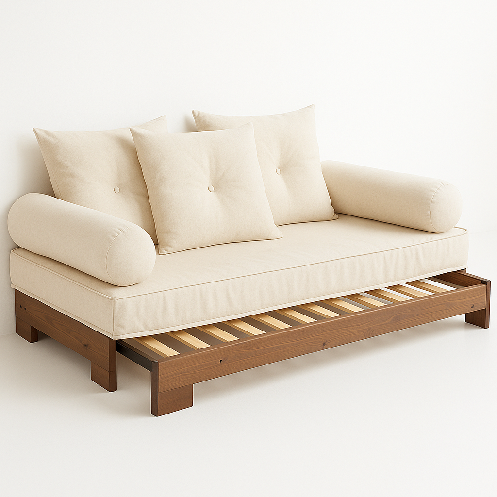 The clean, low-profile frame highlights the natural beauty of the wood grain, while the structured base ensures durability and stability for years to come. Whether in a cozy apartment, vacation home, or family living room, the Woody Sofabed is a smart investment in both style and utility.
