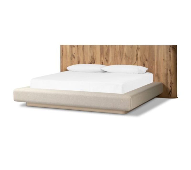 The Zurich Bed blends modern minimalism with natural warmth, creating a bedroom centerpiece that feels both serene and striking. Its solid wood curved headboard highlights the natural grain beautifully, while the upholstered base in soft fabric adds a cozy, grounded touch. Designed for elegance and functionality, this bed works perfectly in contemporary, Japandi, or organic minimalist interiors.